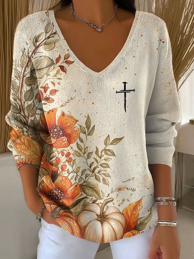 Women's Long Sleeve T-shirt Spring/Fall Orange Floral Printing V Neck Daily Going Out Casual Top