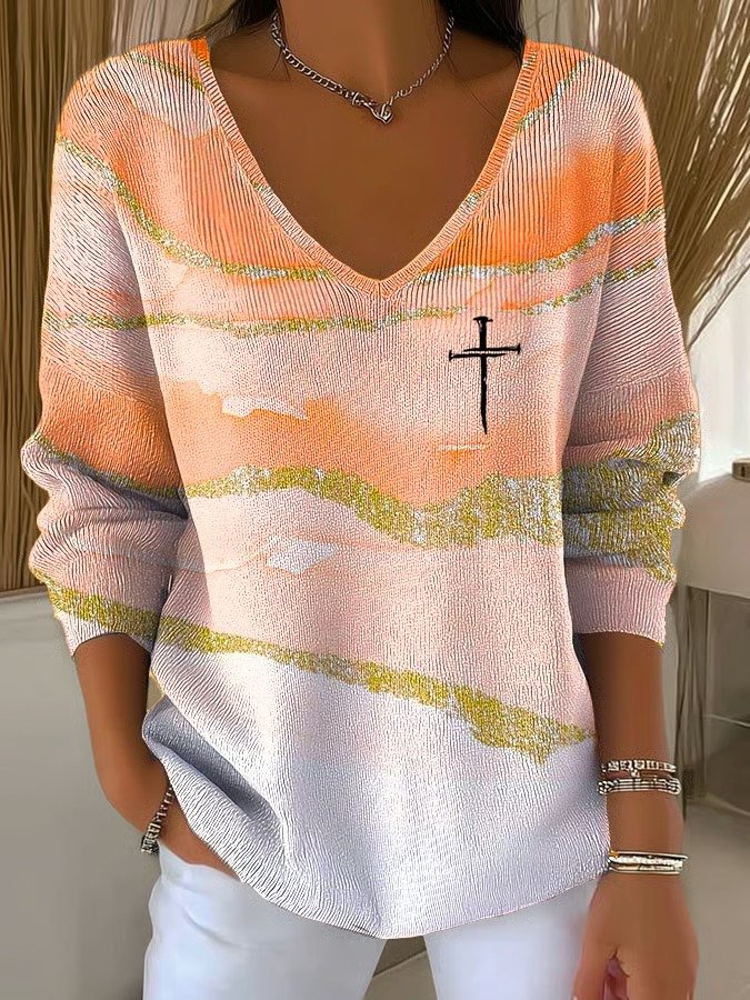 Women's Long Sleeve T-shirt Spring/Fall As Picture Abstract Printing Jersey V Neck Daily Going Out Casual Top