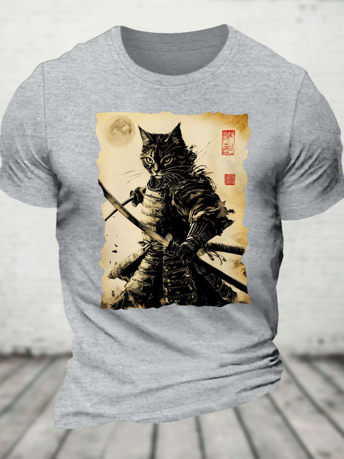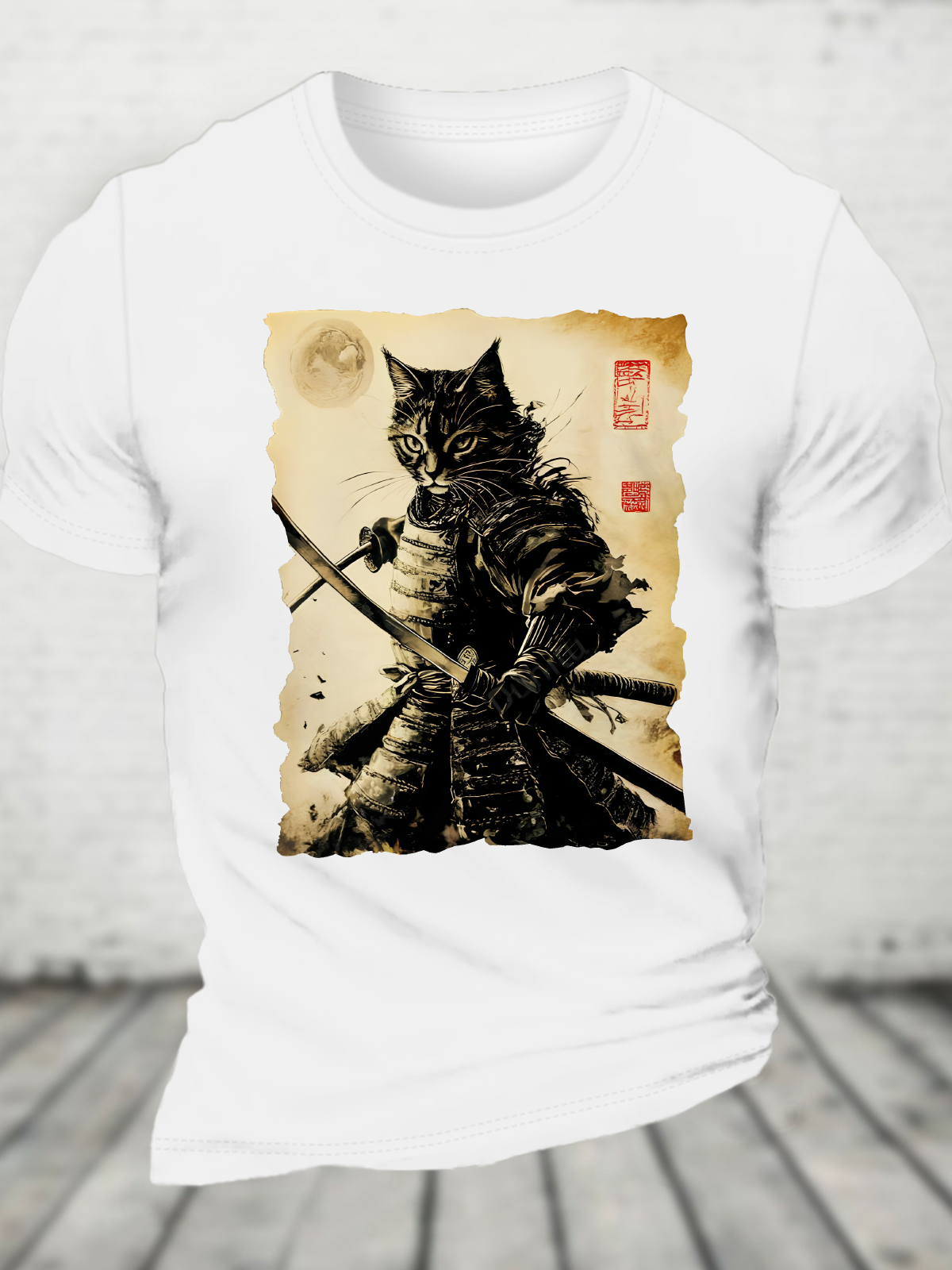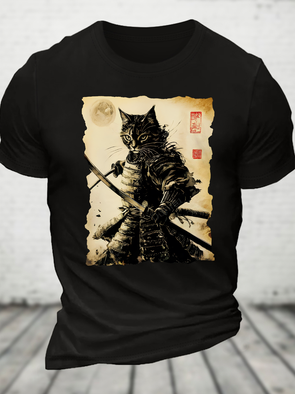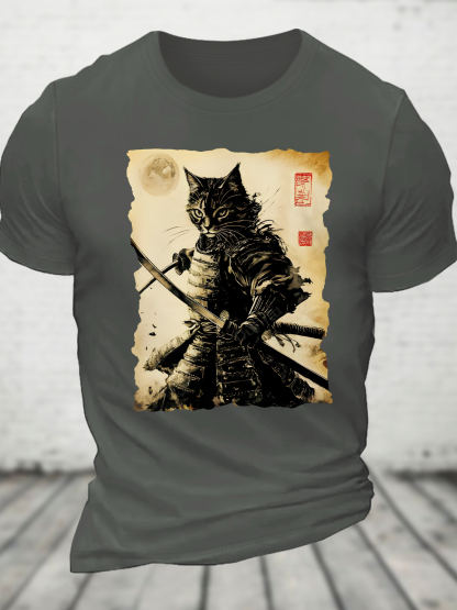 Funny Cat Japanese Samurai Ukiyo-E Art Cotton T-Shirt