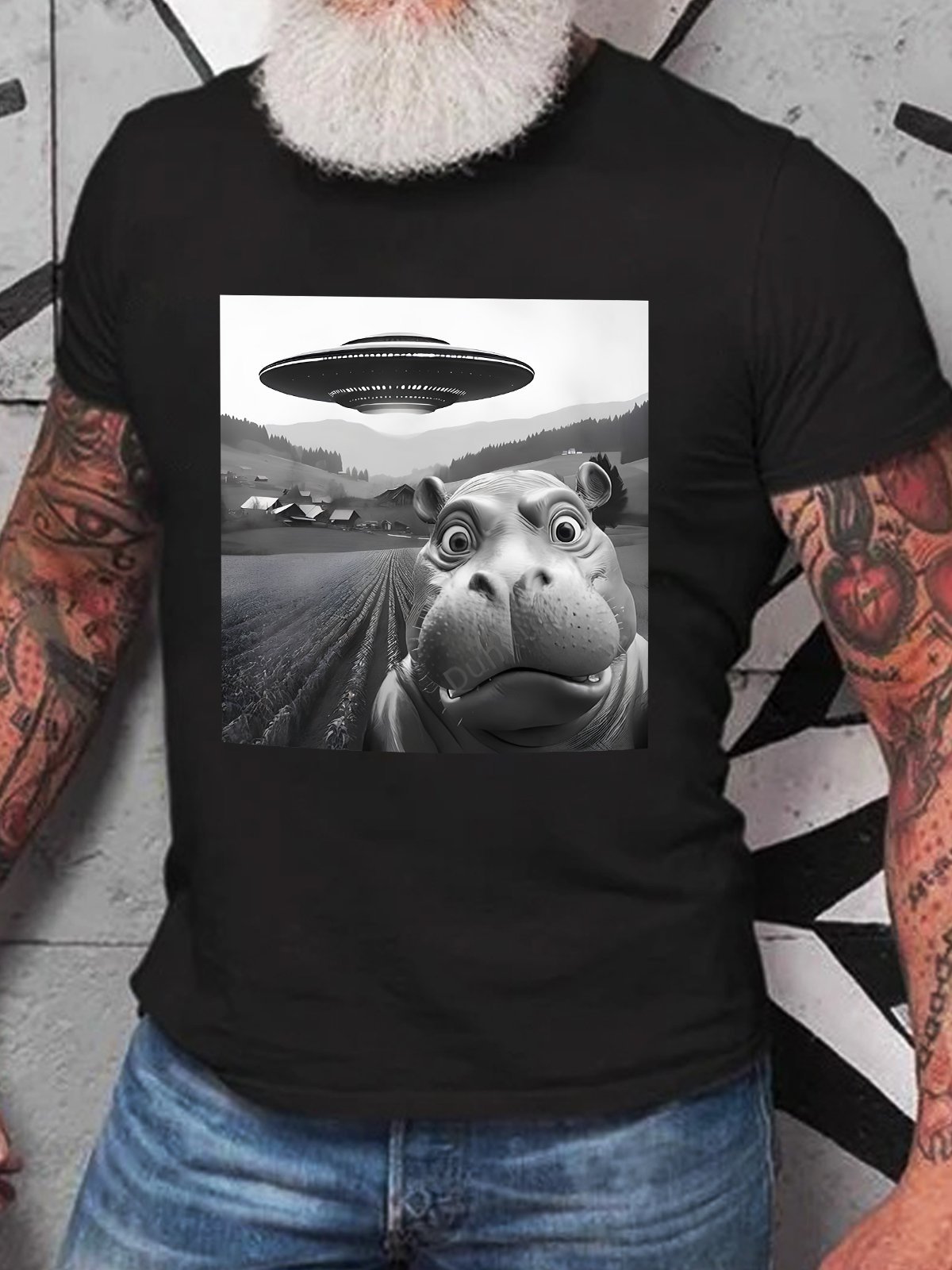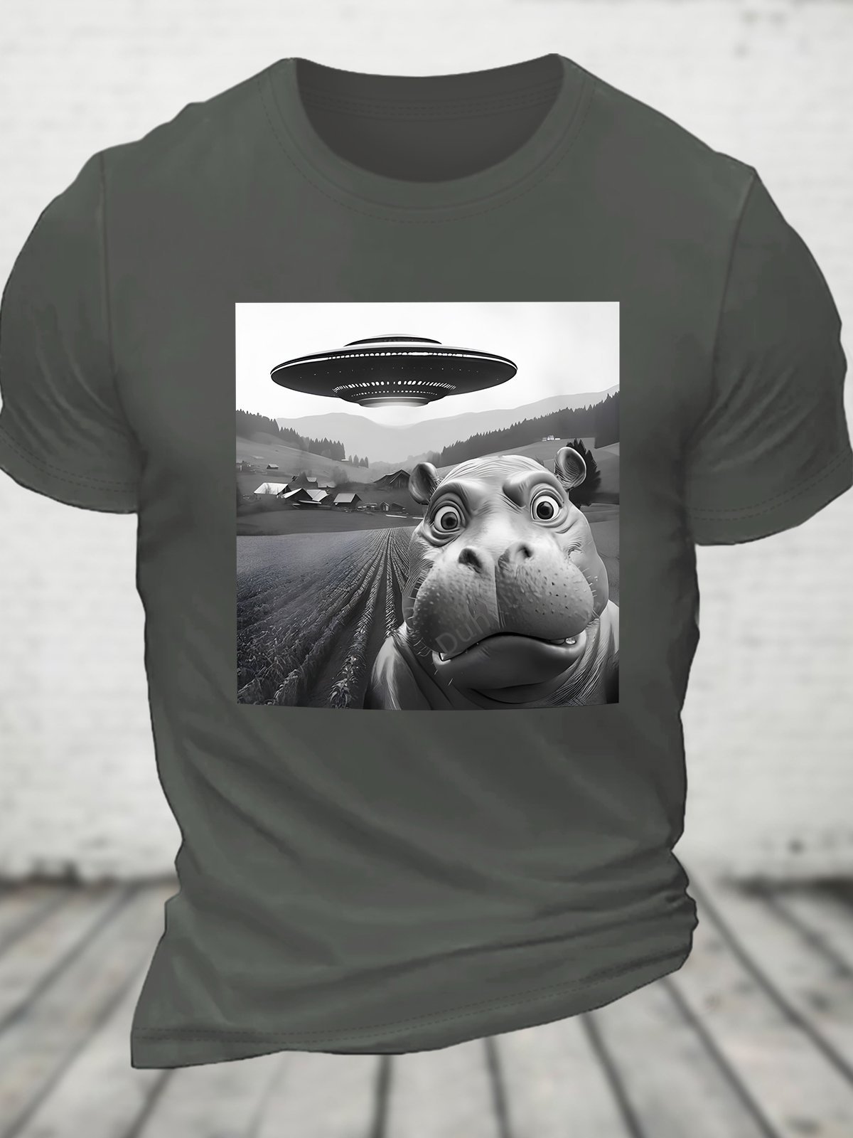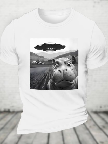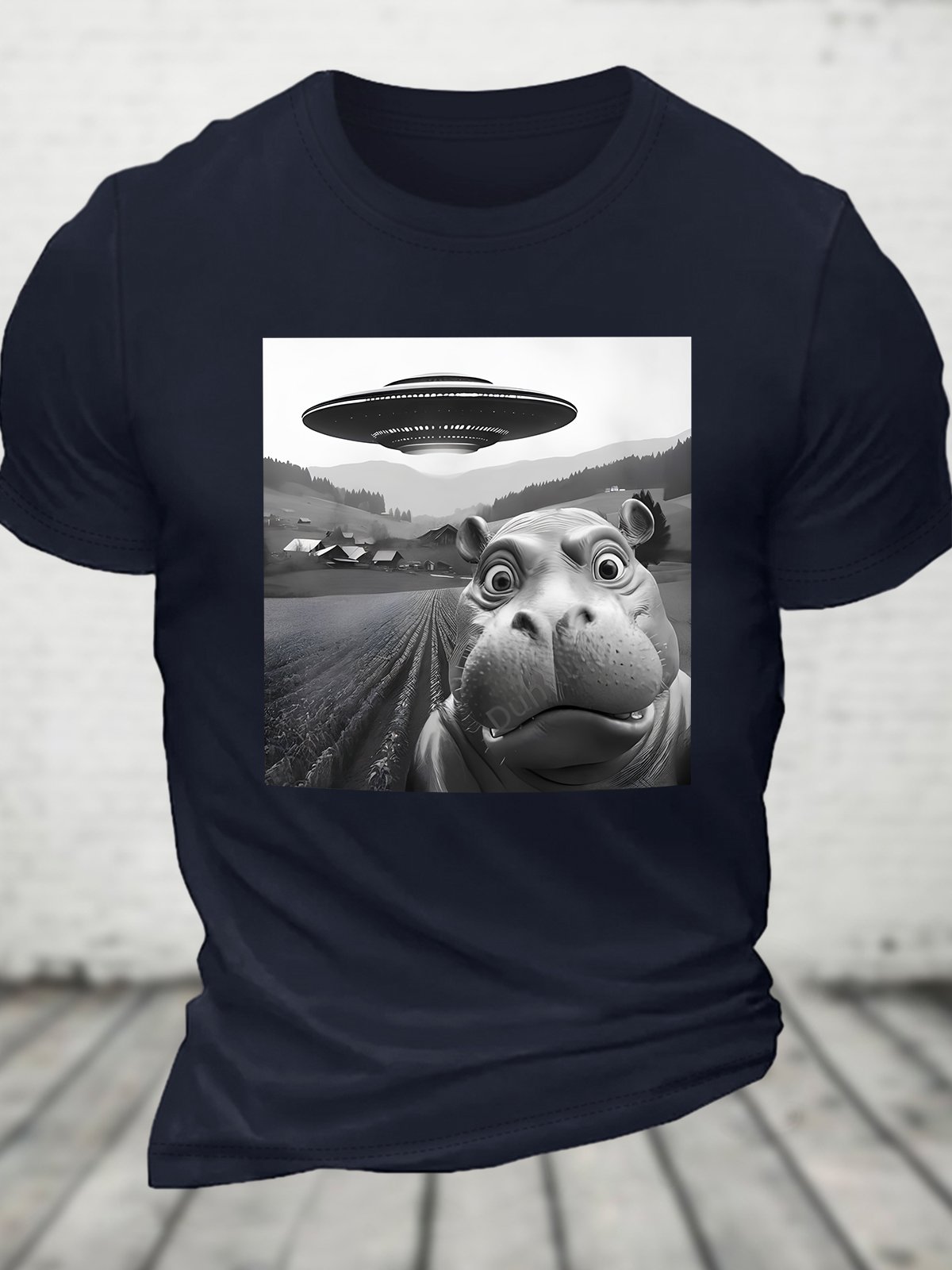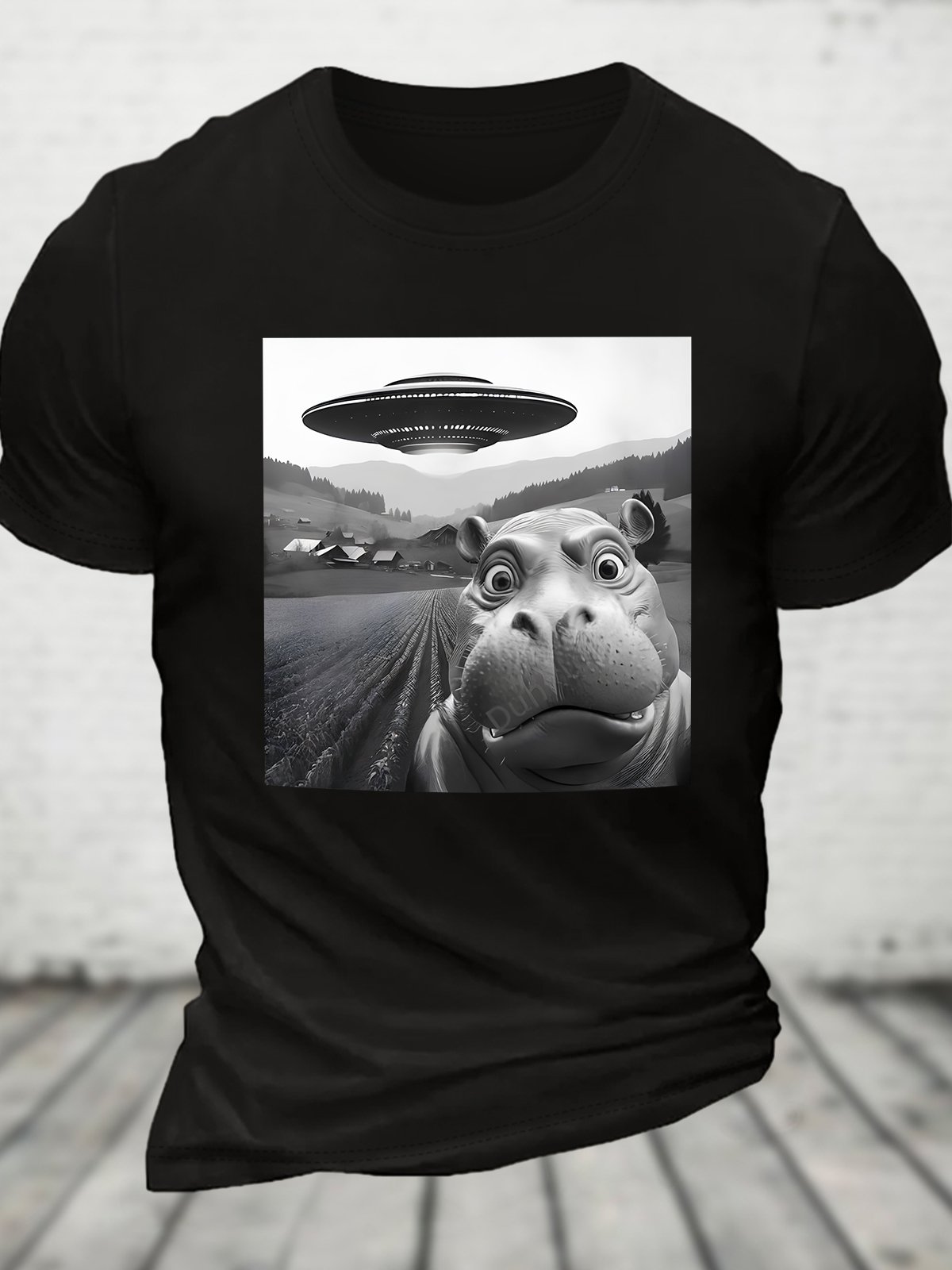 Moo Deng Funny Cute Baby Hippo Selfie with UFOs Alien Cotton T-shirt