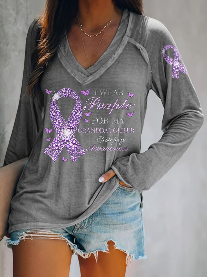 Women's Epilepsy Awareness I Wear Purple For My Granddaughter Purple Ribbon And Butterflies Print T-Shirt