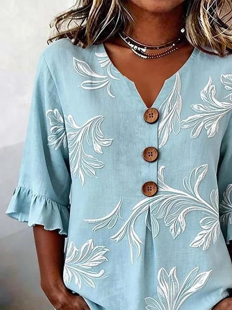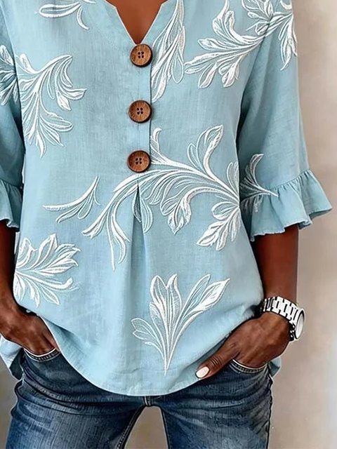 Women's Half Sleeve Blouse Summer Blue Floral Printing V Neck Daily Going Out Vintage Top