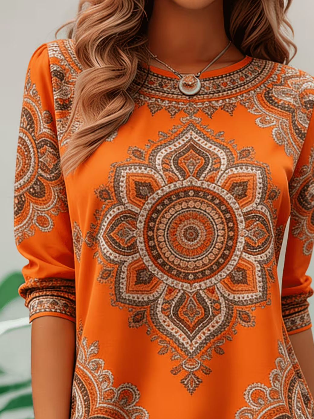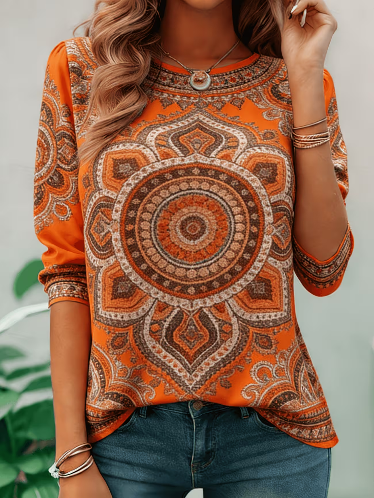 Women's Long Sleeve T-shirt Spring/Fall Orange Ethnic Jersey Crew Neck Daily Going Out Casual Top
