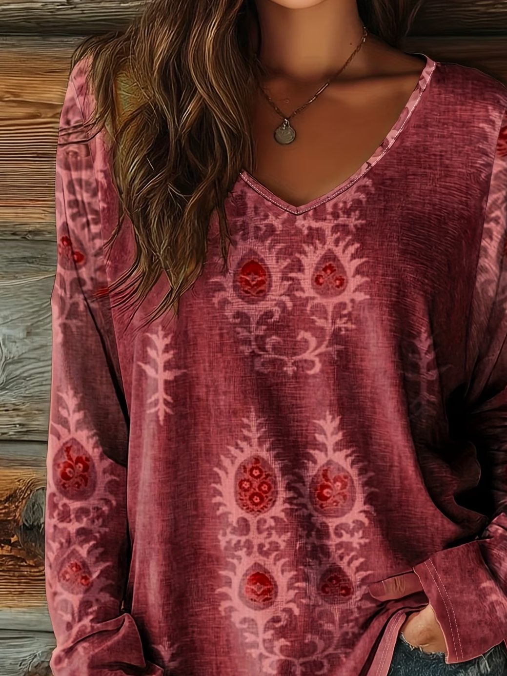 Women's Long Sleeve T-shirt Spring/Fall Red Abstract Printing Jersey V Neck Daily Going Out Casual Top