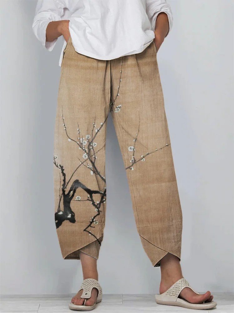 Women's Retro Floral Elegant Art Printed Cotton And Linen Casual Pants