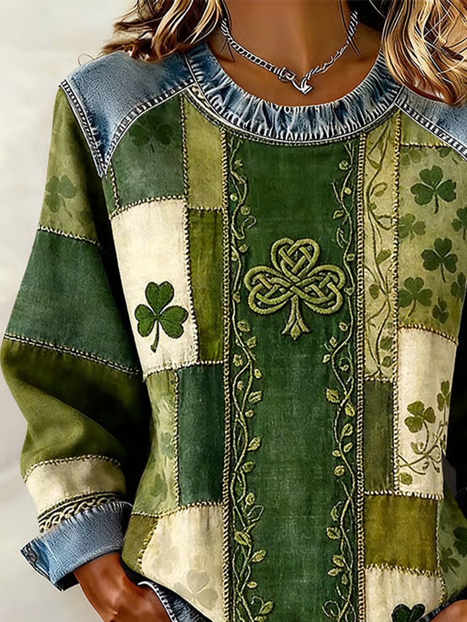 Women's Saint Patrick's Day Print Print Patchwork Denim Crewneck Long-Sleeved Sweatshirt