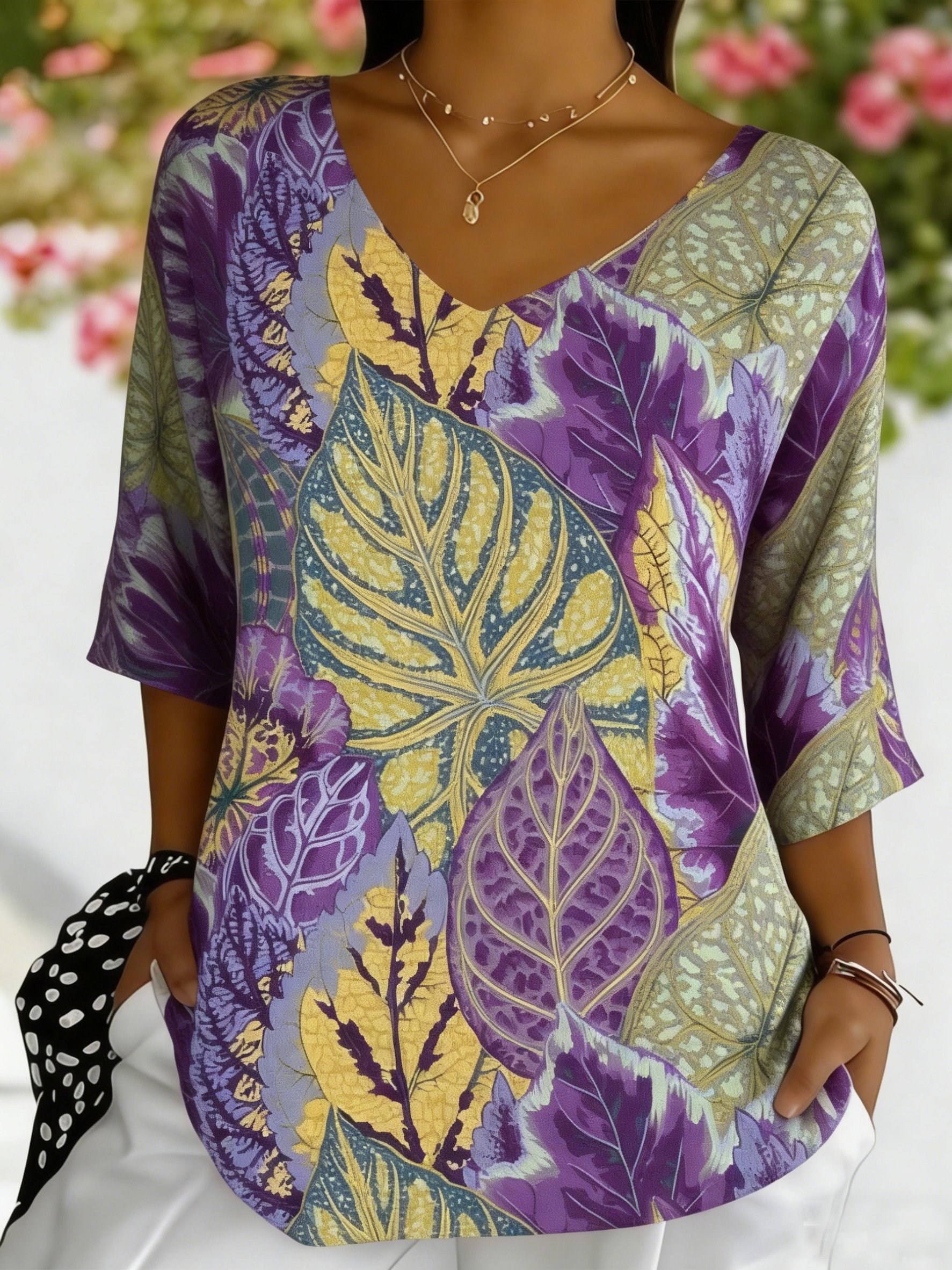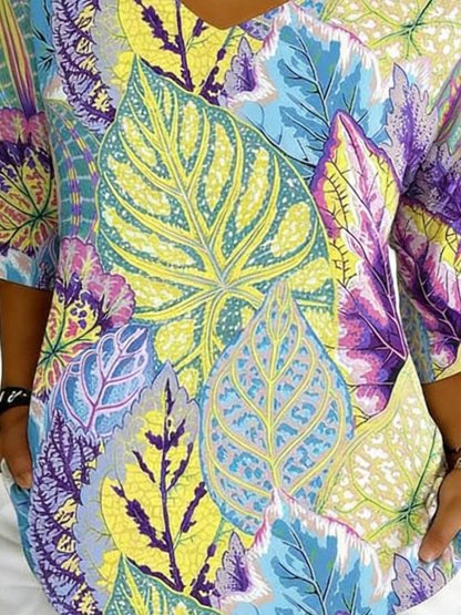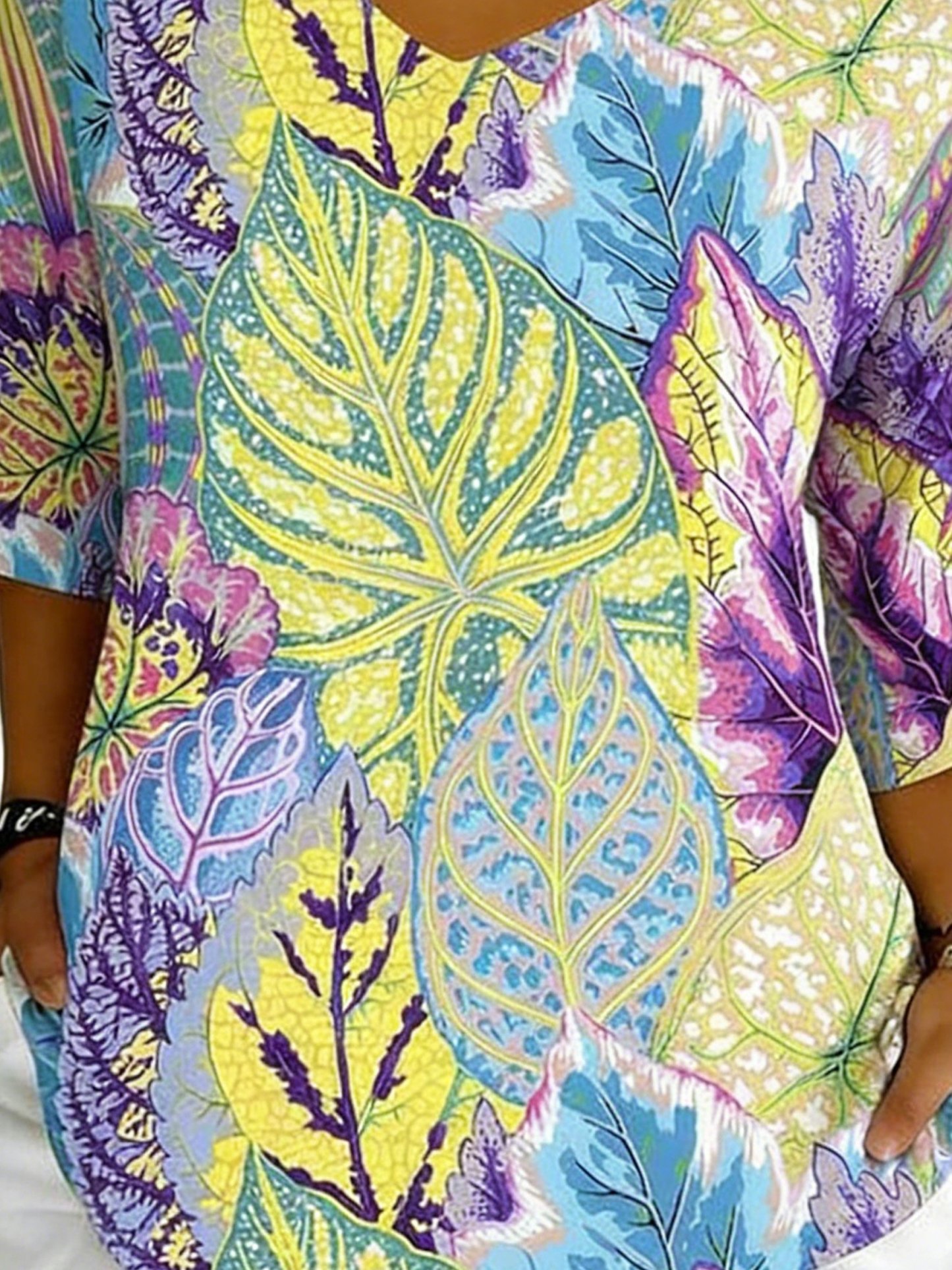 Women's Three Quarter Sleeve T-shirt Spring/Fall Colorful Leaf V Neck Daily Going Out Casual Top