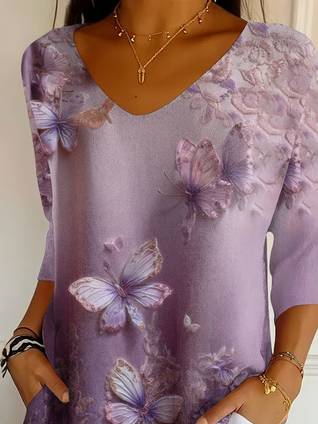 Women's Three Quarter Sleeve T-shirt Spring/Fall Purple Butterfly Printing V Neck Daily Going Out Casual Top