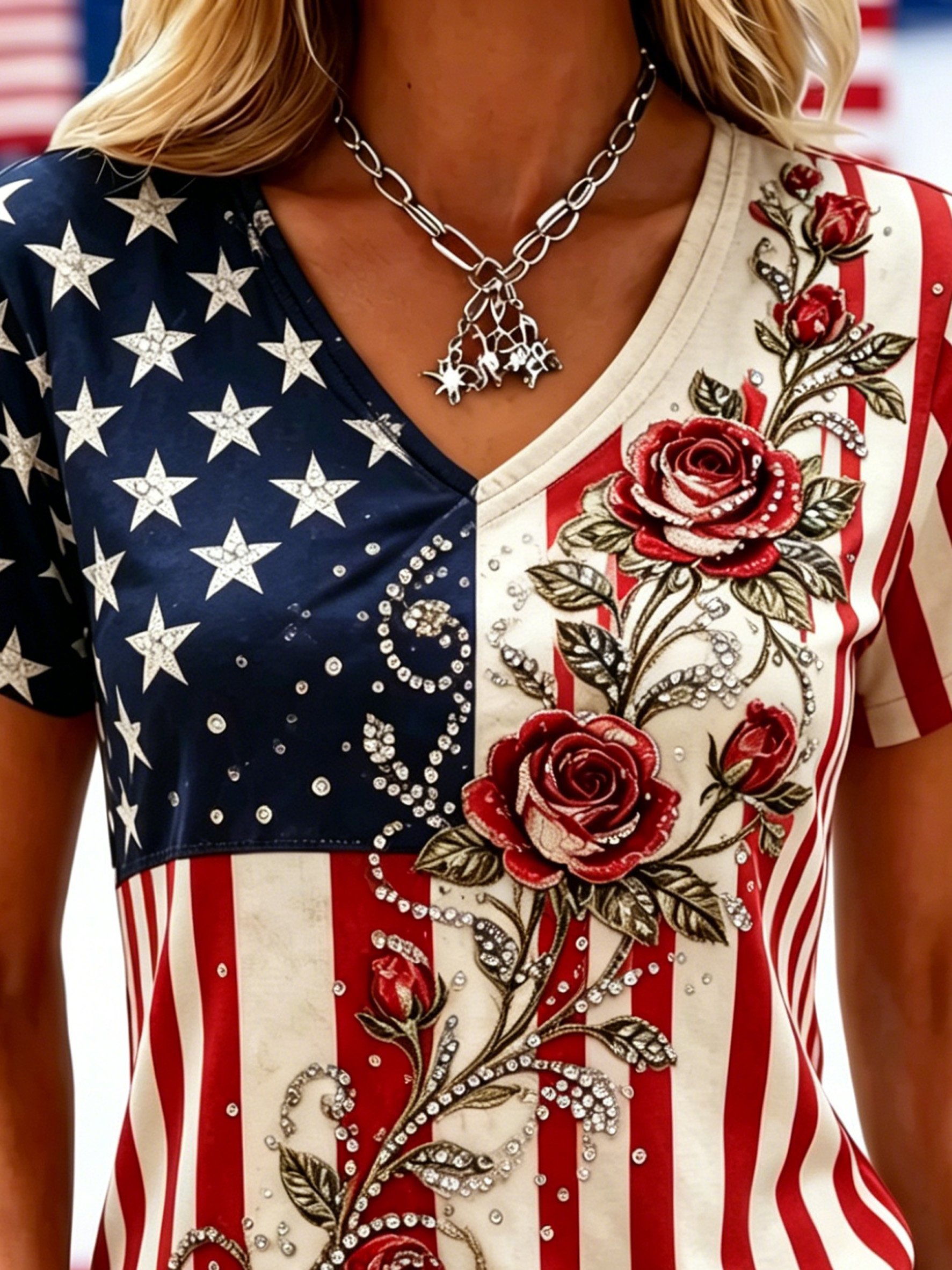 Vintage 3D Printing America Flag Floral Short Sleeve V Neck Casual T-Shirt