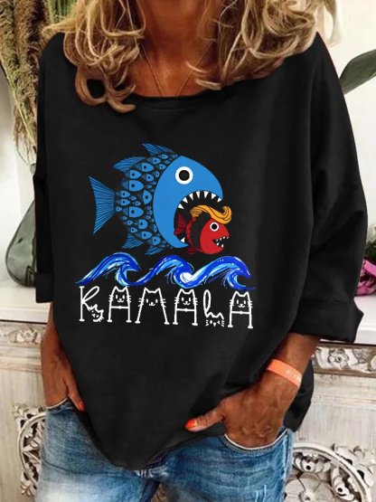Blue Wave Big Fish Eats Small Fish Print Casual Sweatshirt