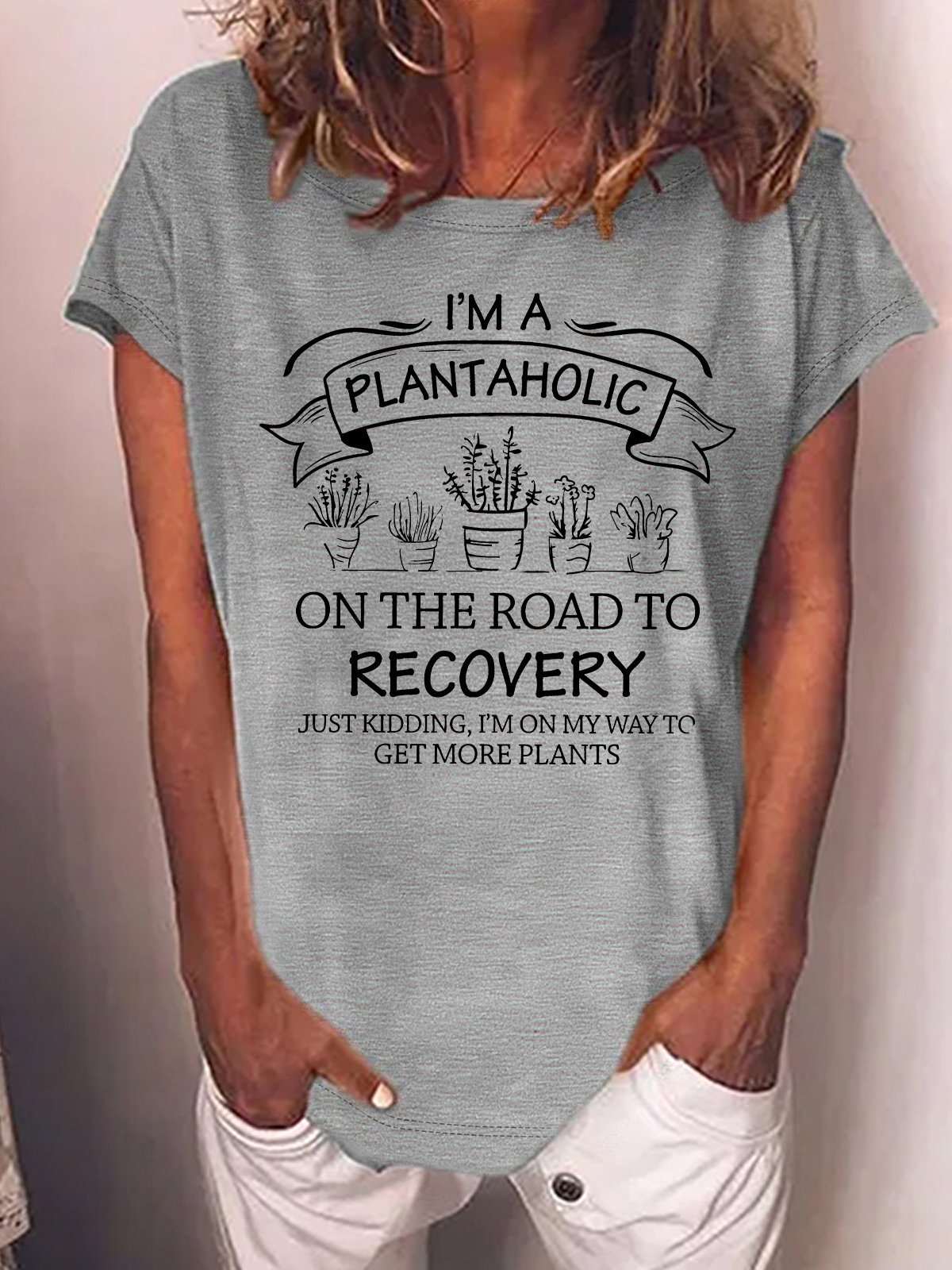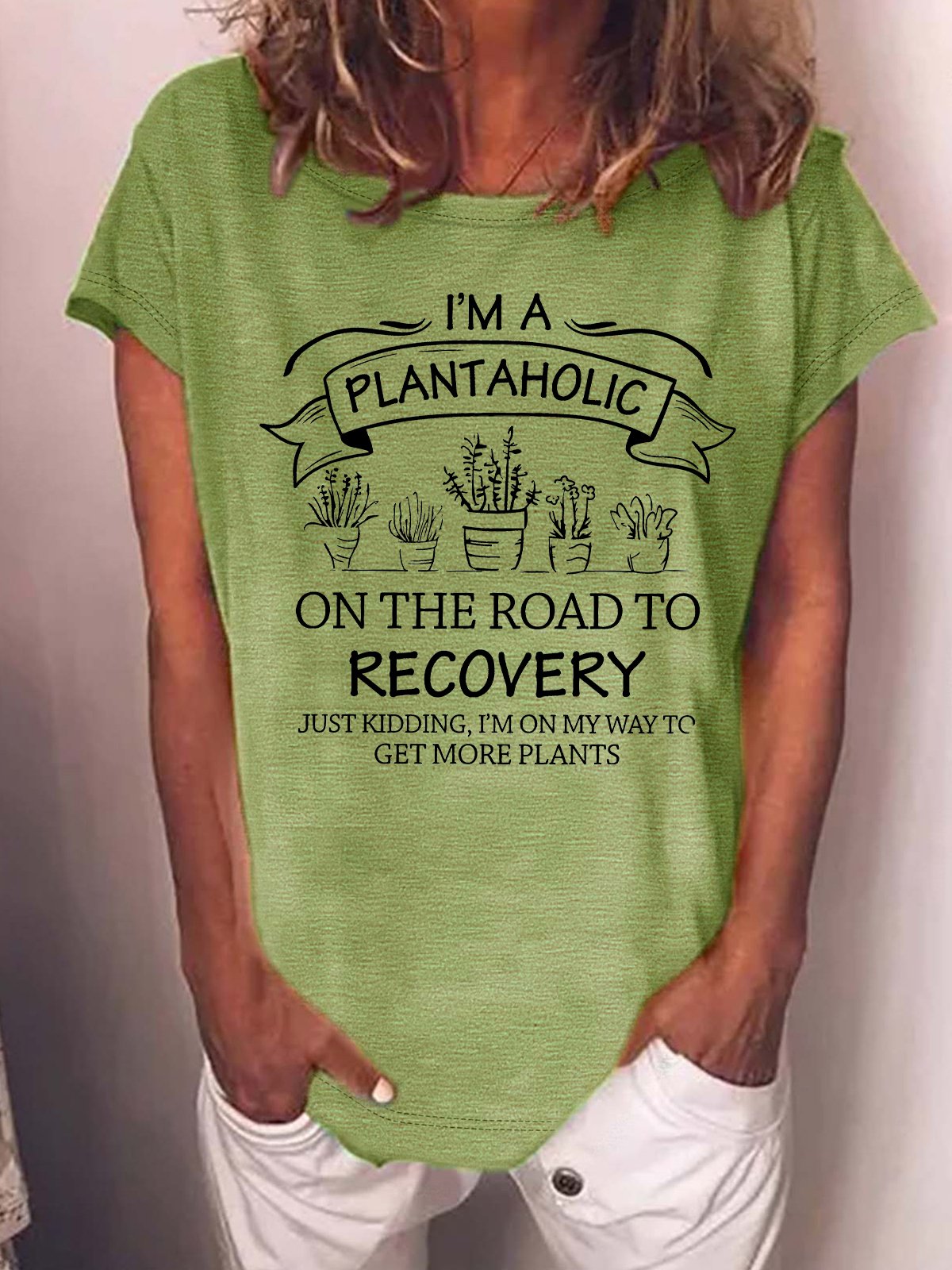 Women's I Am A Plantaholic On The Road To Recovery Just Kidding I Am On My Way To Get More Plants Funny Graphic Printing Casual Loose Cotton-Blend Crew Neck T-Shirt