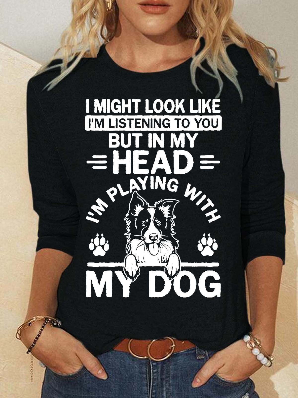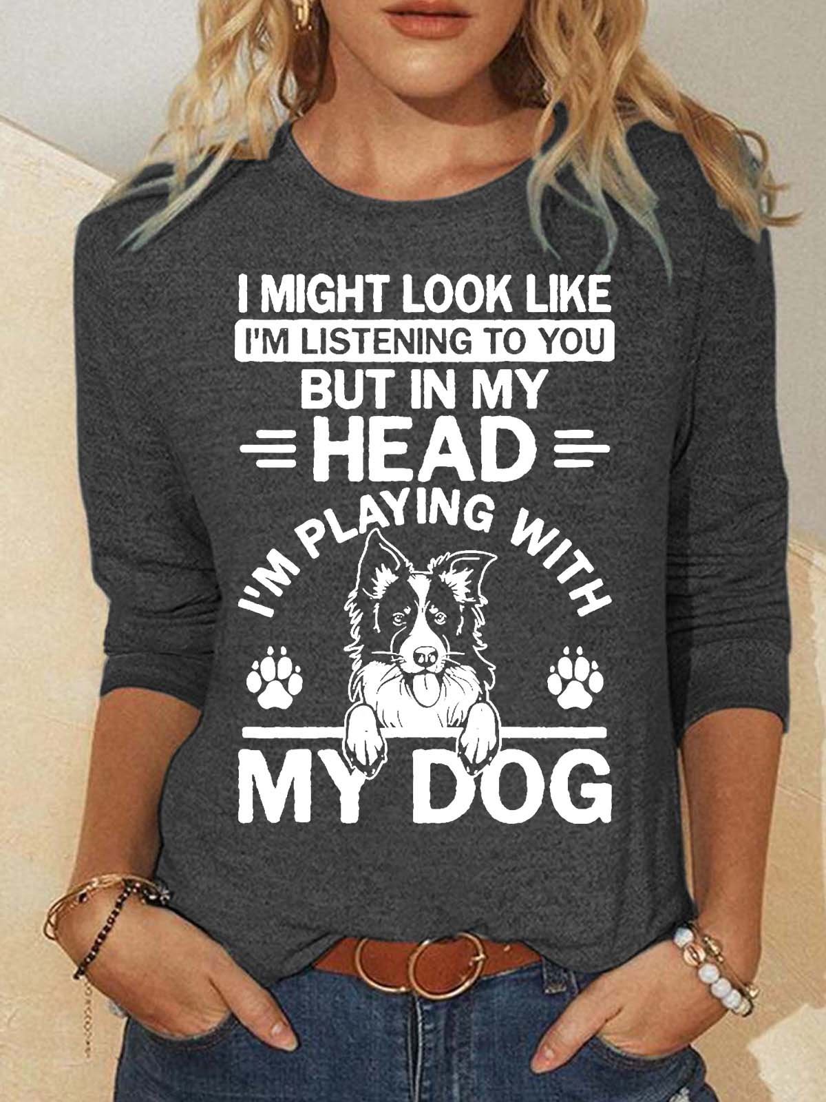 Women’s I Might Look Like I’m Listening To You But In My Head I’m Playing With My Dog Crew Neck Animal Polyester Cotton Casual Top