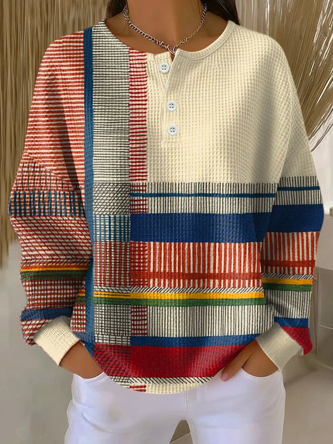 Women's Abstract Print Button-Up Casual Waffle Knit Sweatshirt