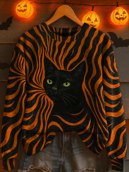 Women'S Casual Orange Leopard And Cat Print Sweatshirt