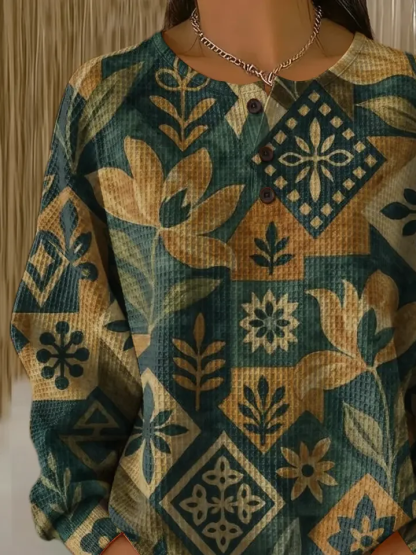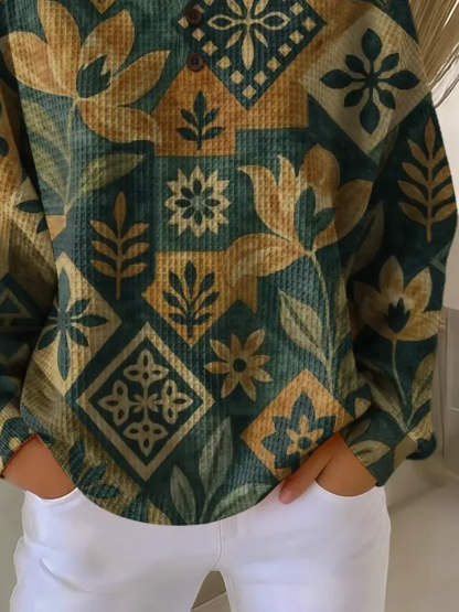 Women's Flowers Print Button-Up Casual Waffle Knit Sweatshirt