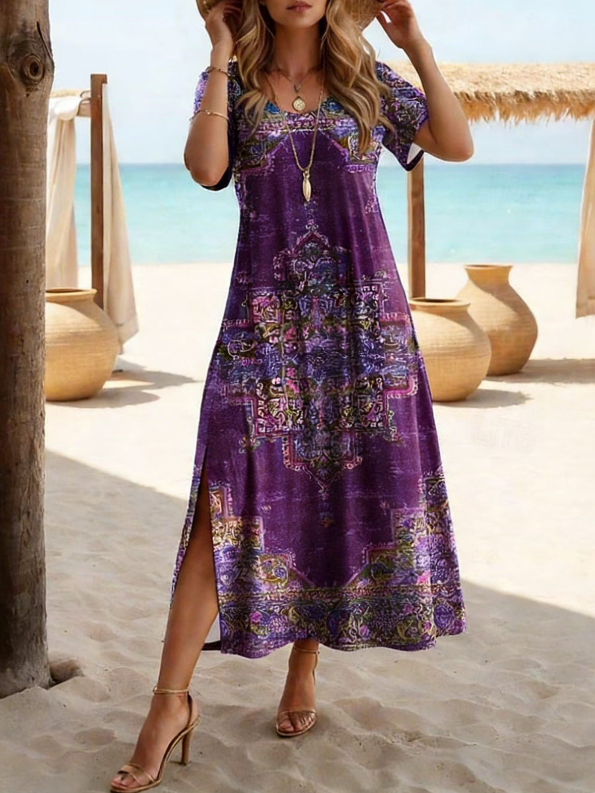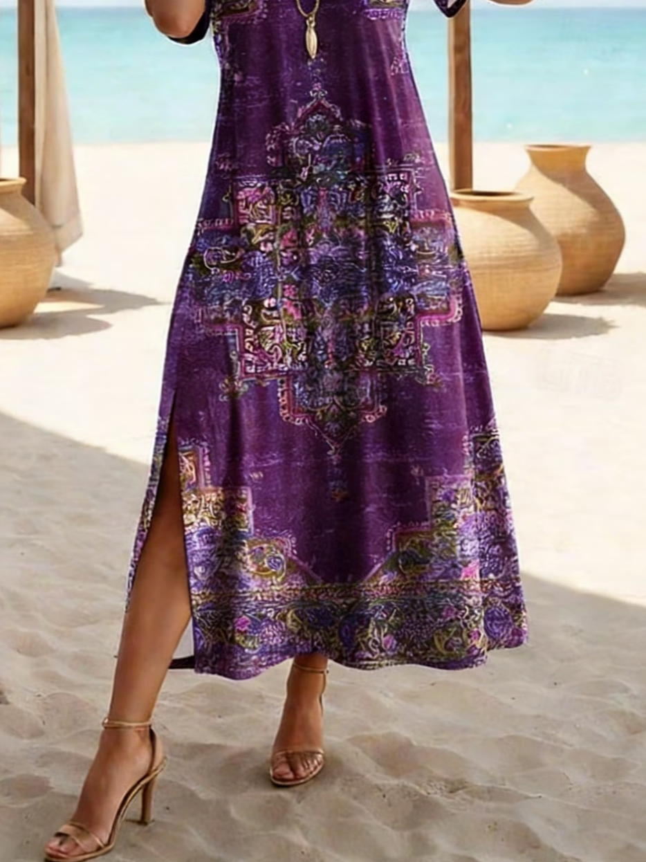 Women's Short Sleeve Summer Purple Abstract Printing Crew Neck Daily Going Out Casual Maxi H-Line T-Shirt Dress Dress