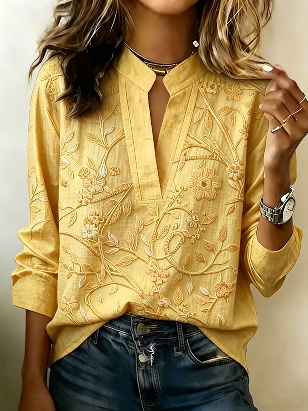 Women's V-Neck Button-Down Printed Long-Sleeve Shirt