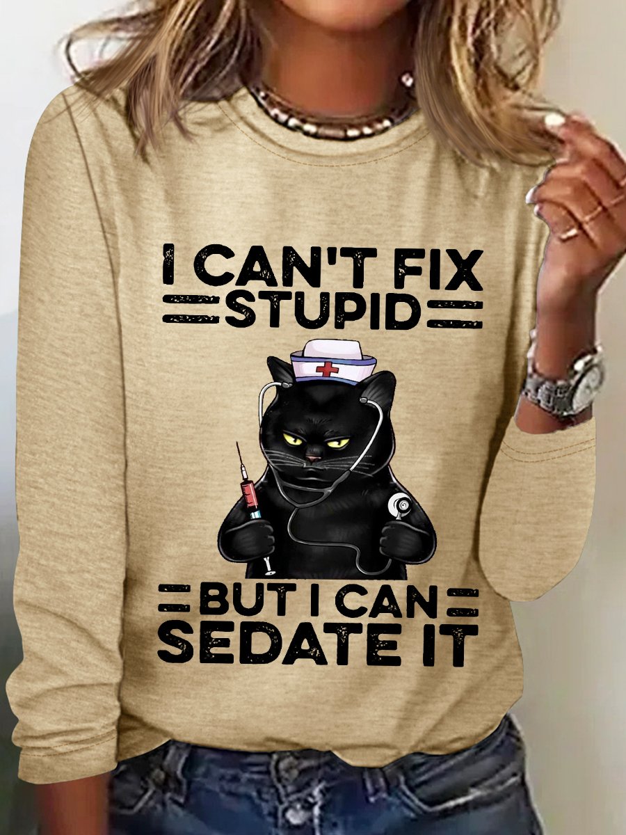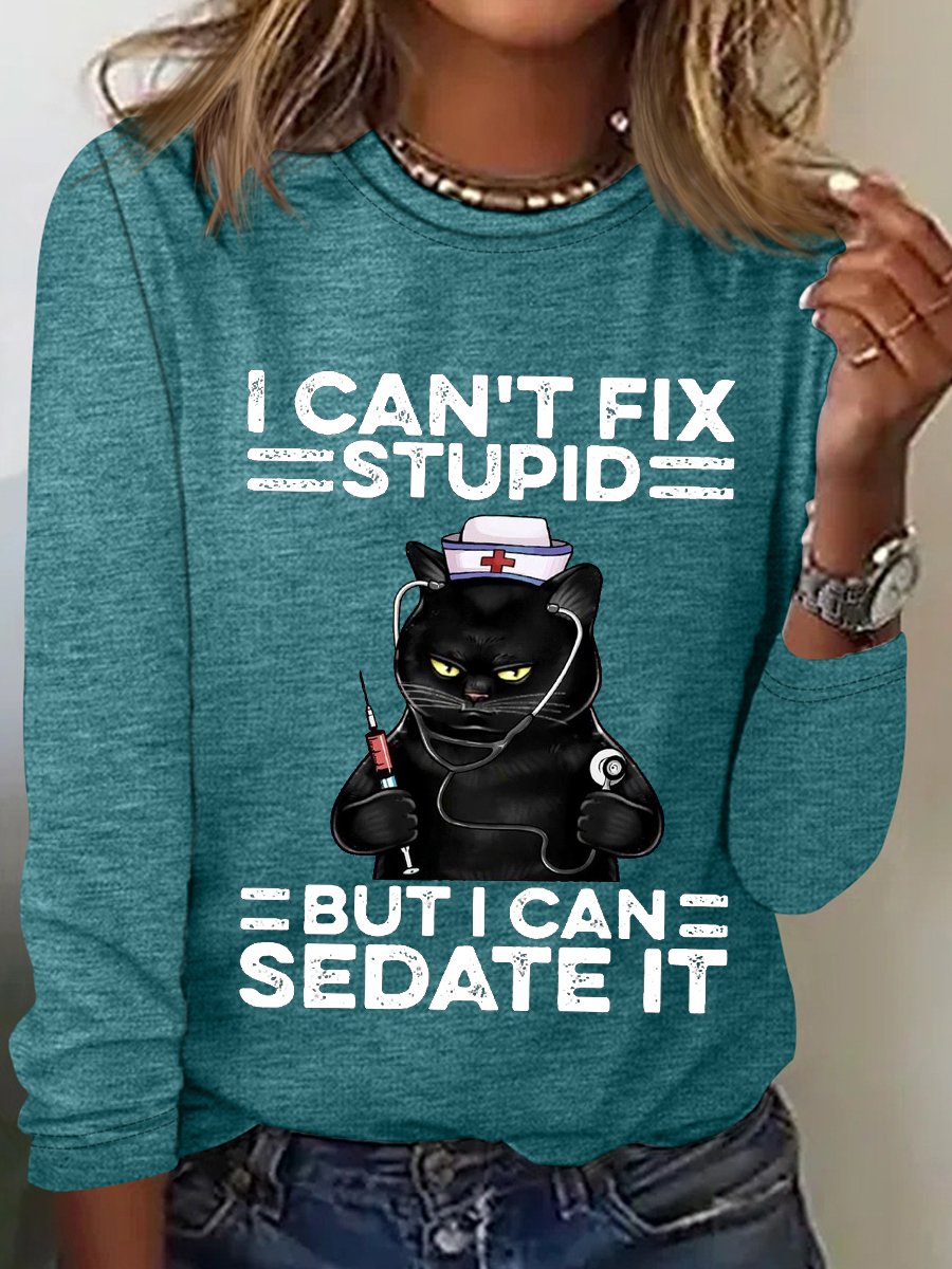 Women‘s Funny Black Cat Nurse I Can't Fix Stupid But I Can Sedate It Cotton-Blend Long Sleeve Top