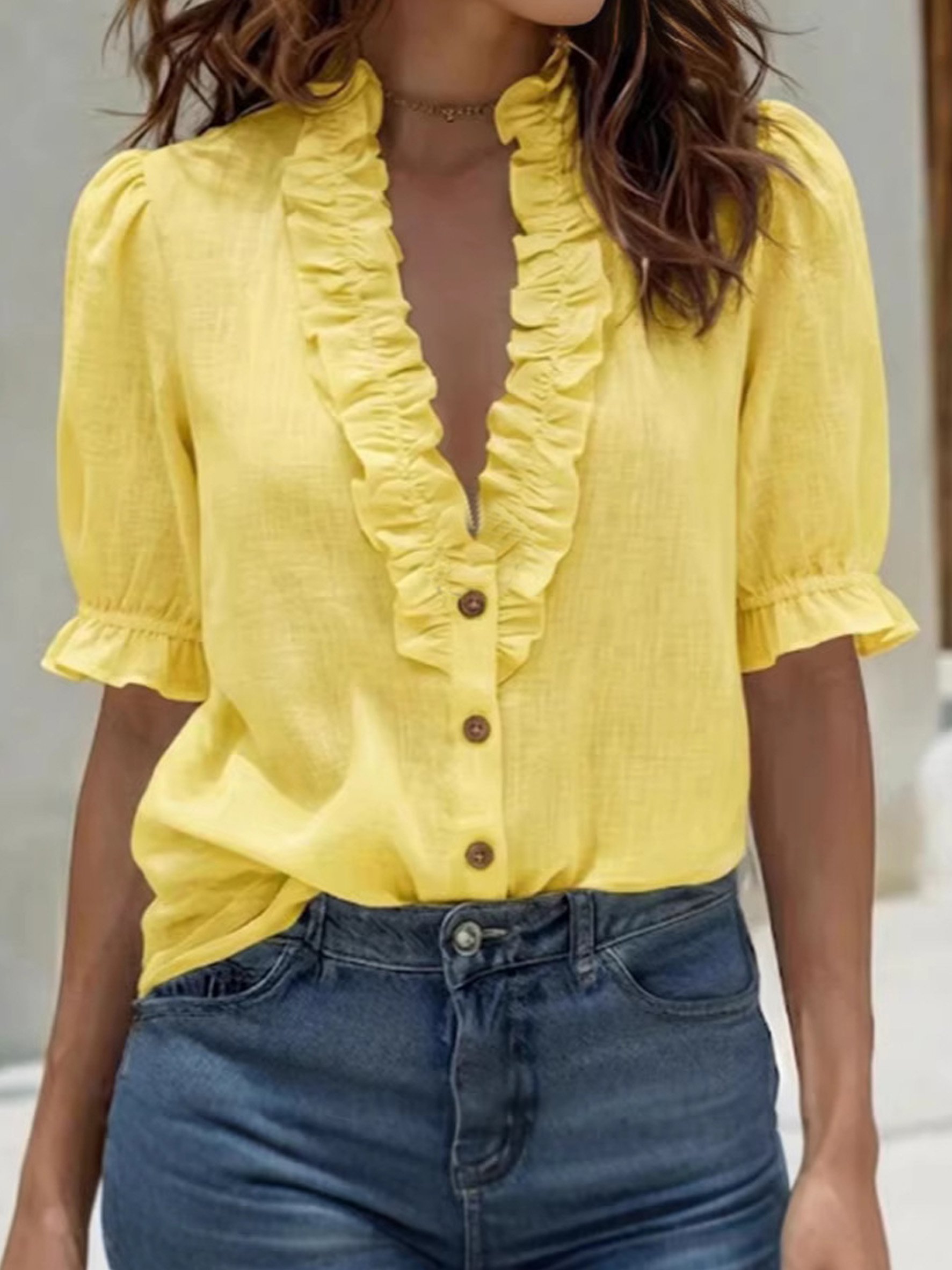Cotton And Linen V Neck Puff Half Sleeve Ruffle Button Casual Blouse
