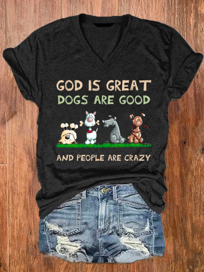 Women's God Is Great Dog Is Good And People Are Crazy Print Casual Cotton-Blend V Neck Loose T-Shirt