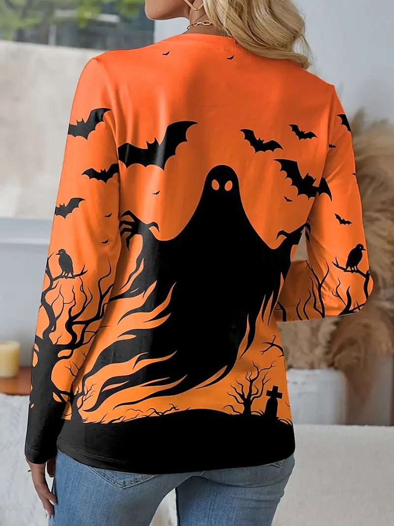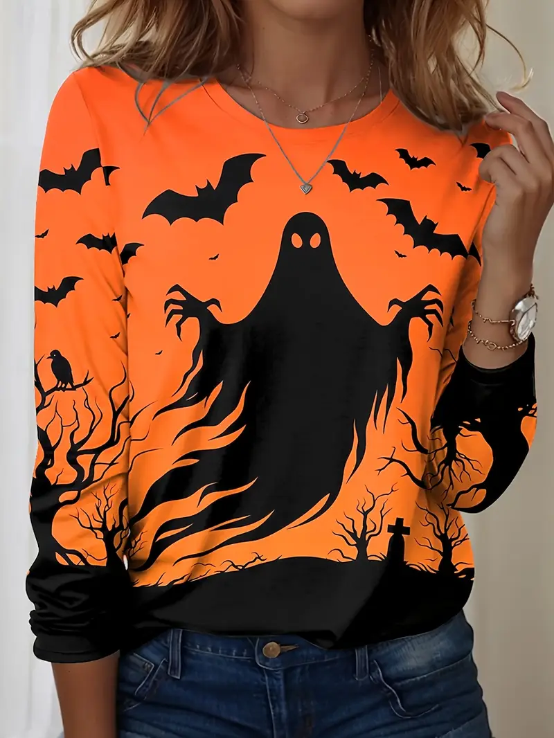 Women's Long Sleeve T-shirt Spring/Fall Orange Halloween Printing Jersey Crew Neck Daily Going Out Casual Top