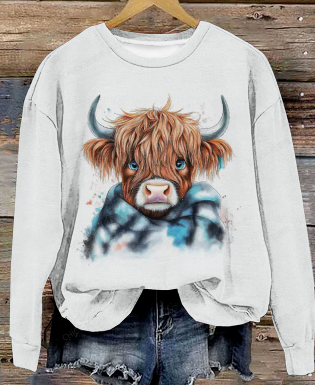 Scottish Highland Cattle Wearing A Plaid Scarf Sweatshirt