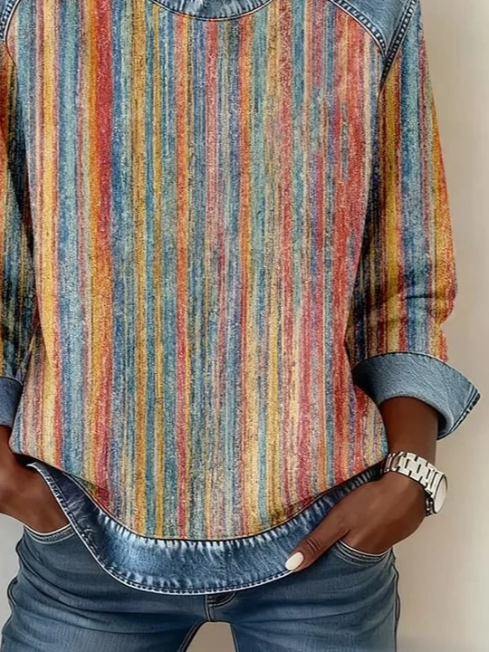 Women's Abstract Stripes Print Patchwork Denim Crewneck Long-Sleeved Sweatshirt