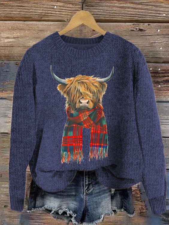 Women's Cute Highland Cow Print Knitted Crew Neck Sweater