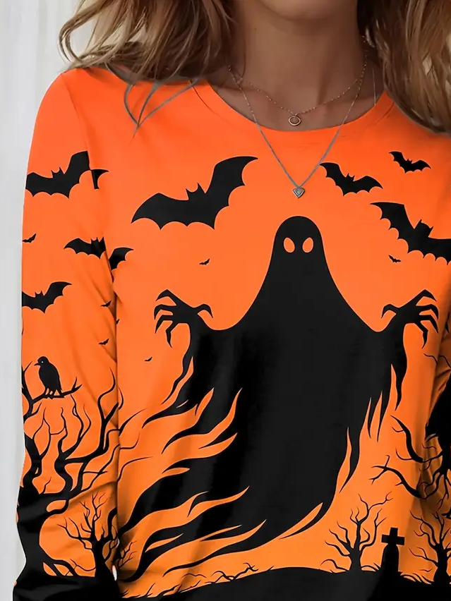 Women's Long Sleeve T-shirt Spring/Fall Orange Halloween Printing Jersey Crew Neck Daily Going Out Casual Top