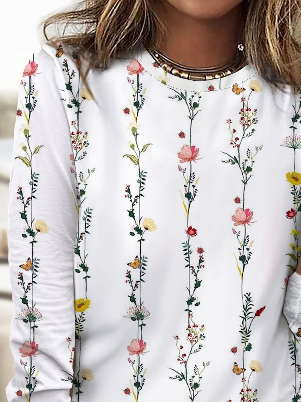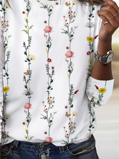 Floral print round neck long sleeved casual T-shirt
