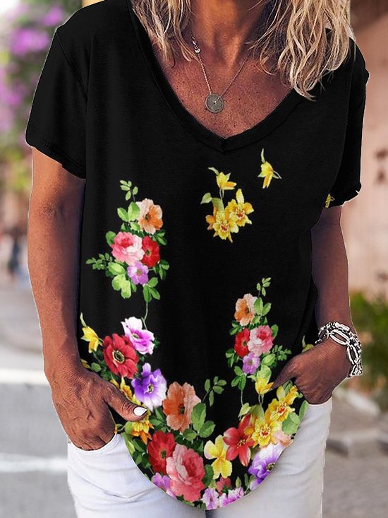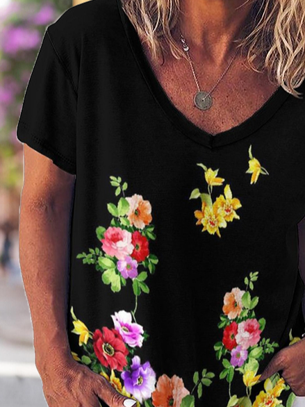 V Neck Casual Floral Short Sleeve T-Shirt