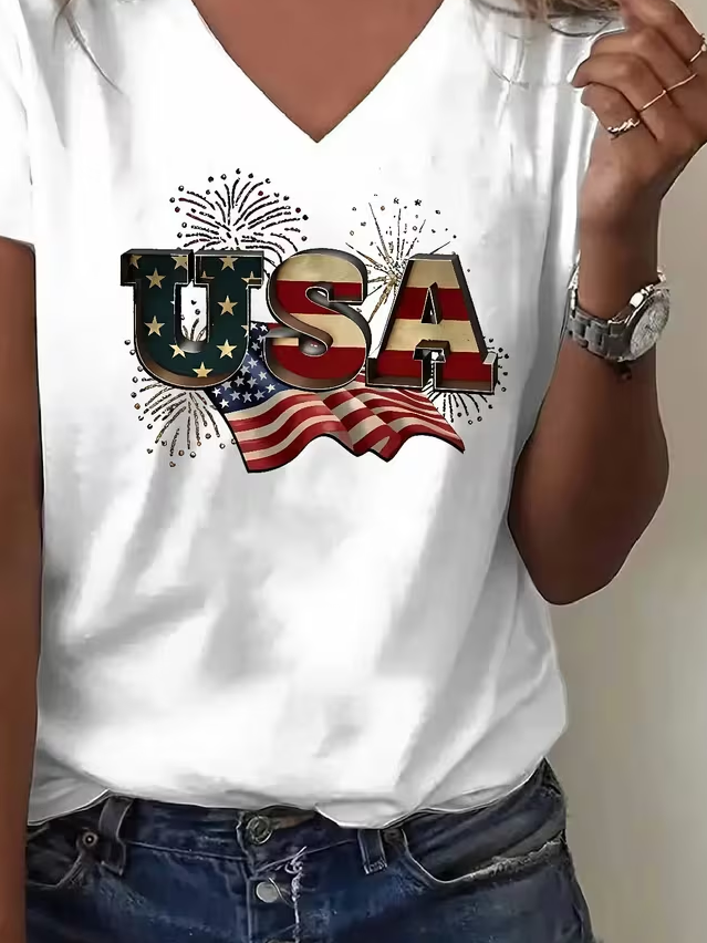 Women's USA 250th Anniversary Short Sleeve T-shirt Summer White Text Letters Jersey V Neck Holiday Going Out Casual Top