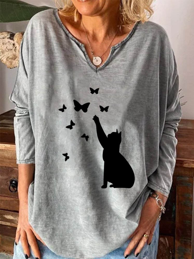 Cat and butterfly print V-neck long-sleeved top