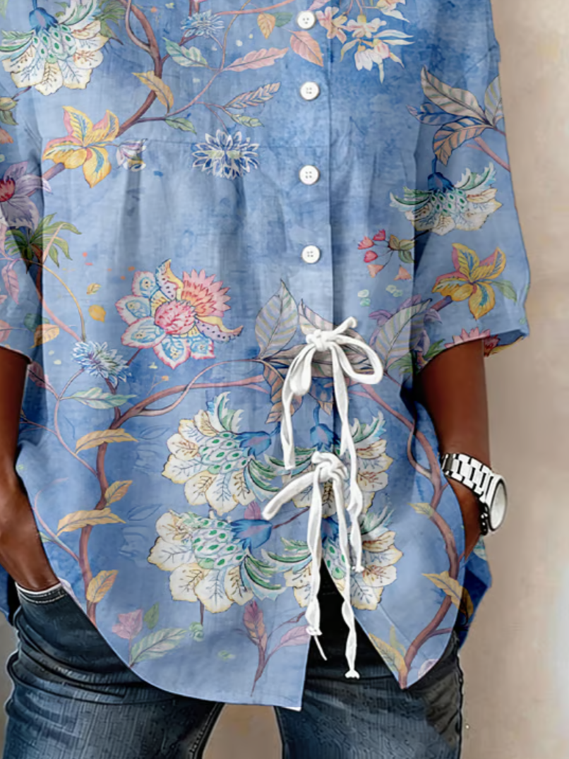 Elegant Botanical Pattern Loose Crew Neck Blouse