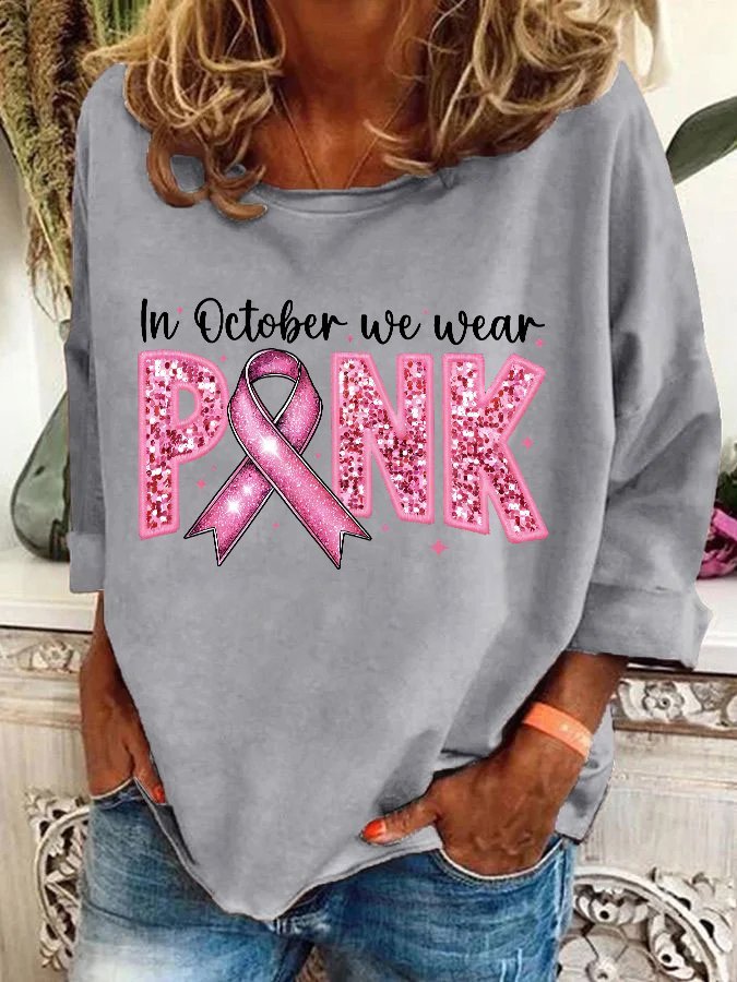 In October We Wear Pink Embroidery Breast Cancer Awareness Casual Sweatshirt