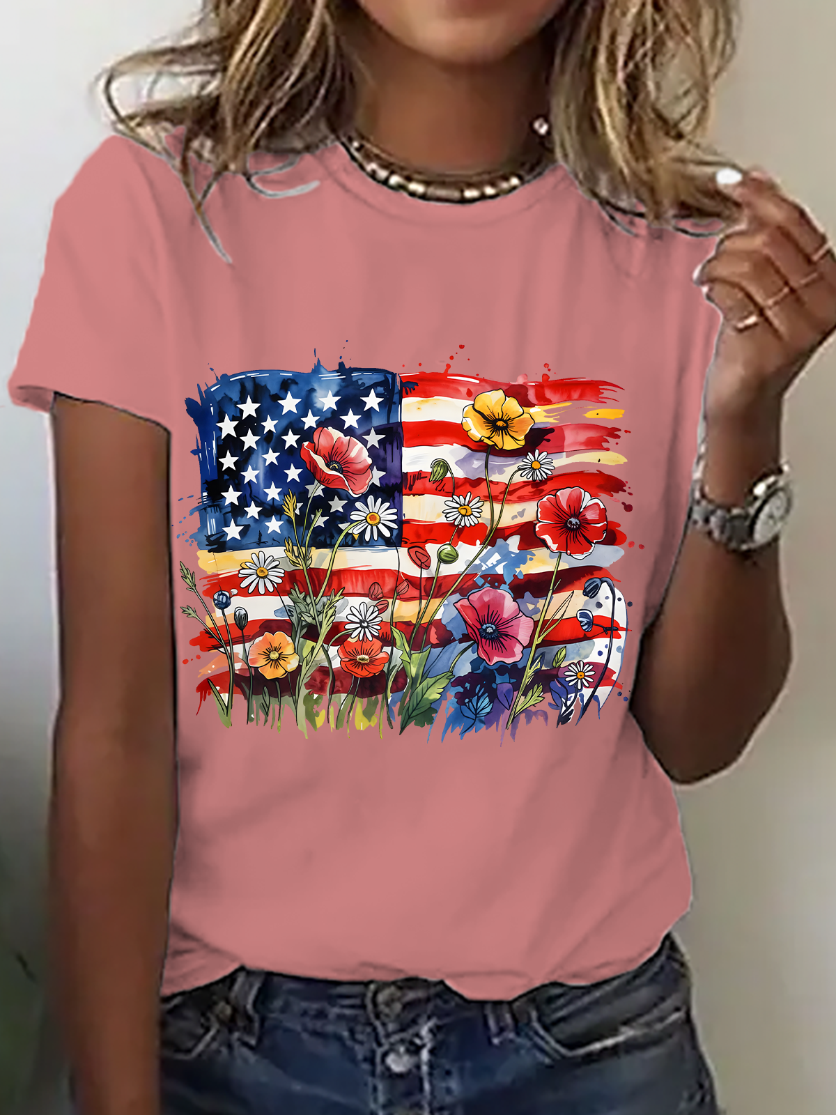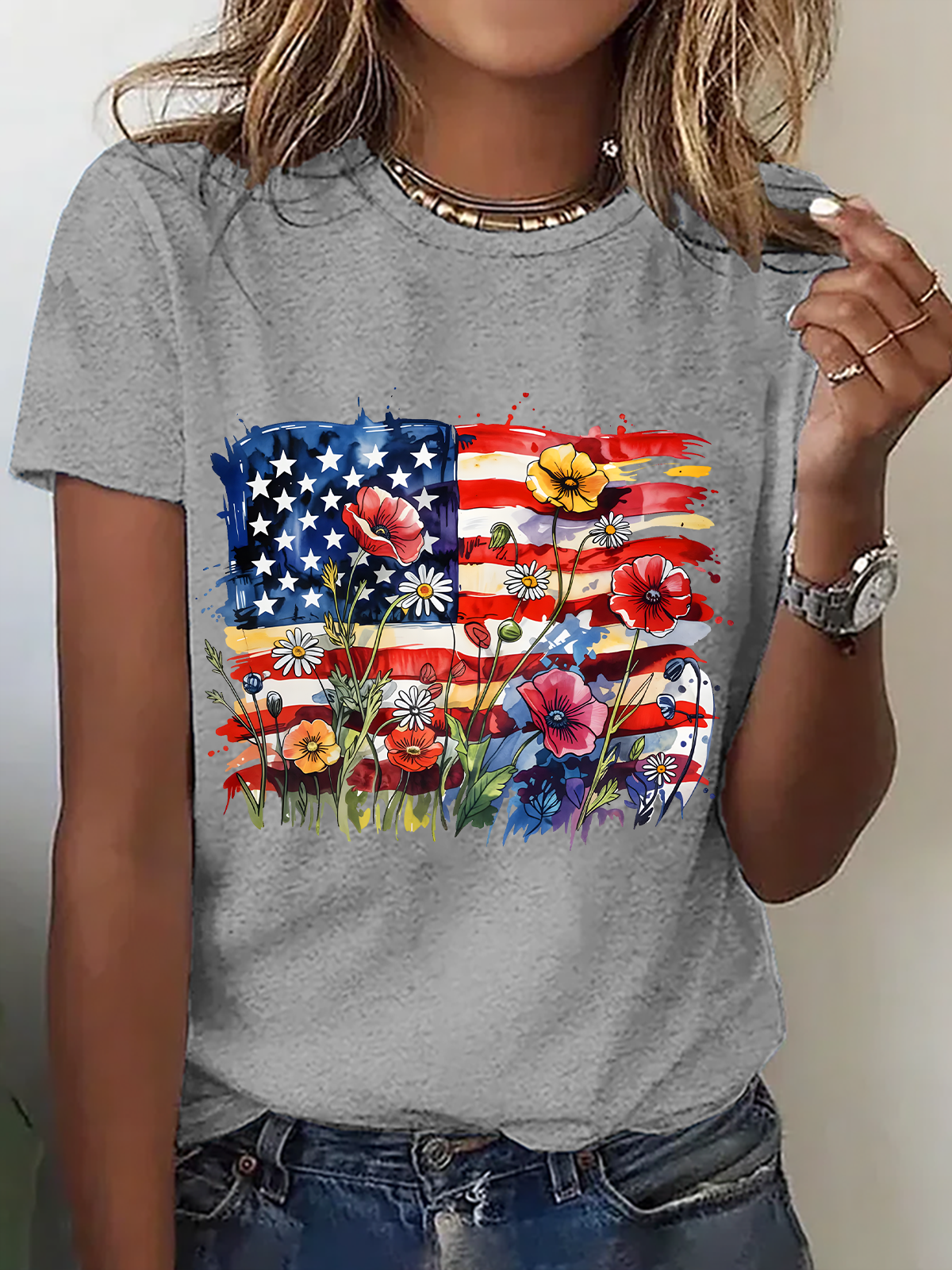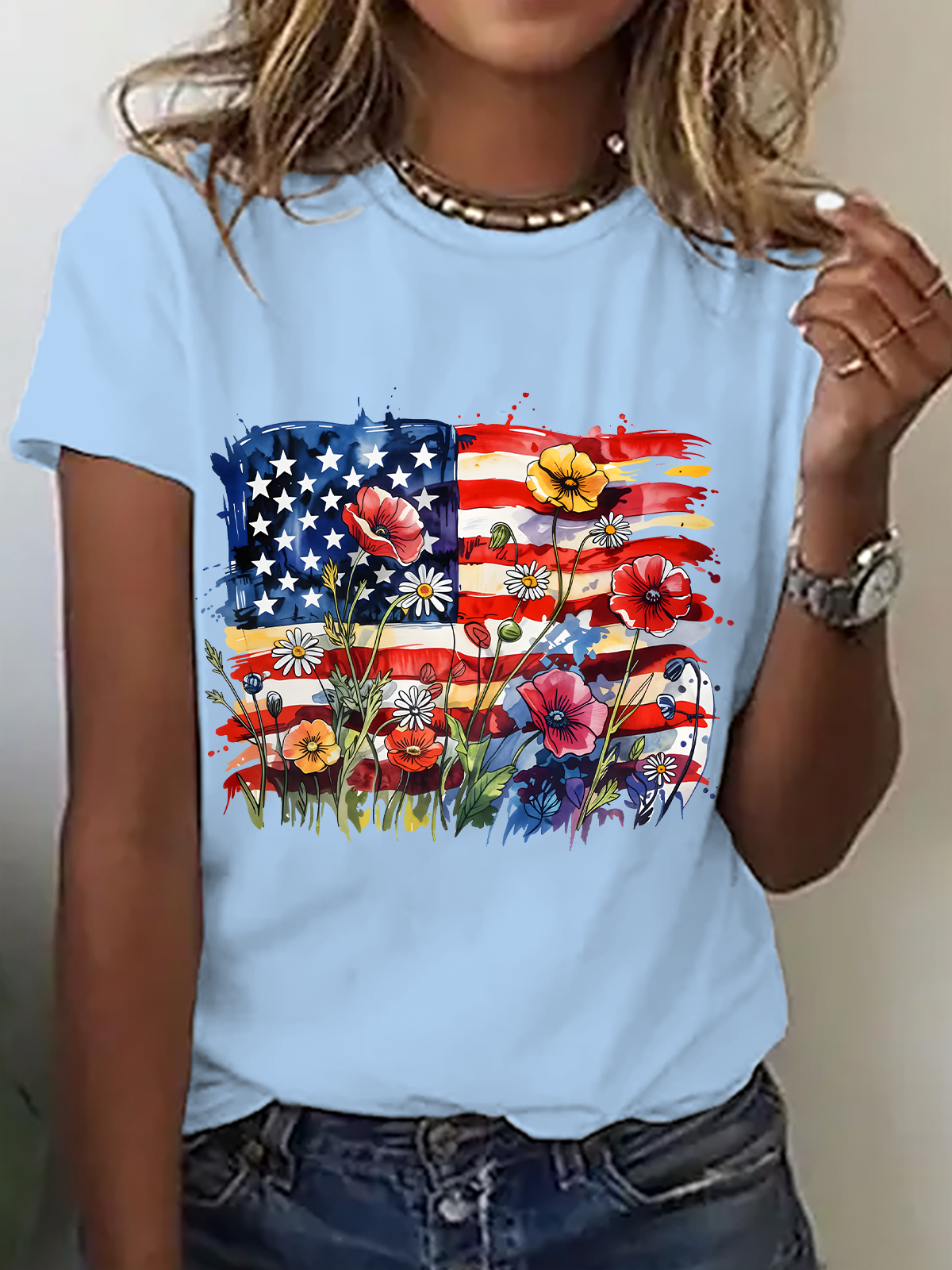 American Flag Floral Cotton T-Shirt