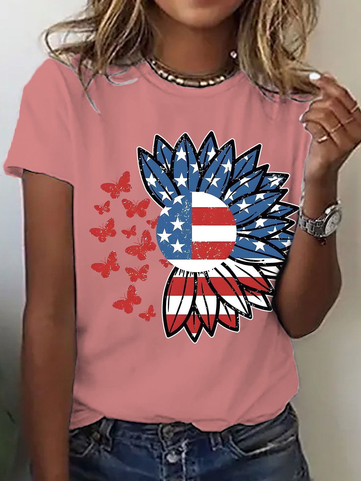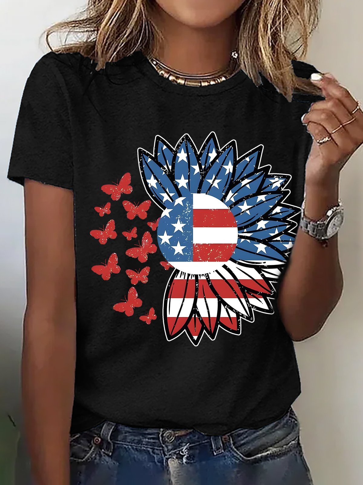 American Flag With Flowers And Butterflies Cotton T-shirt
