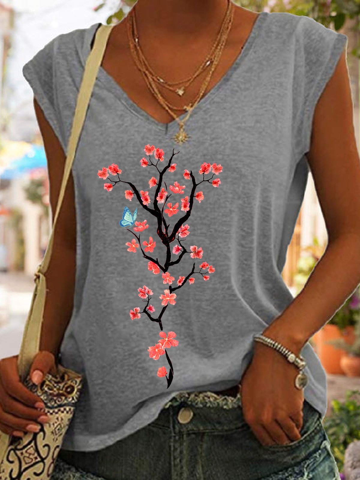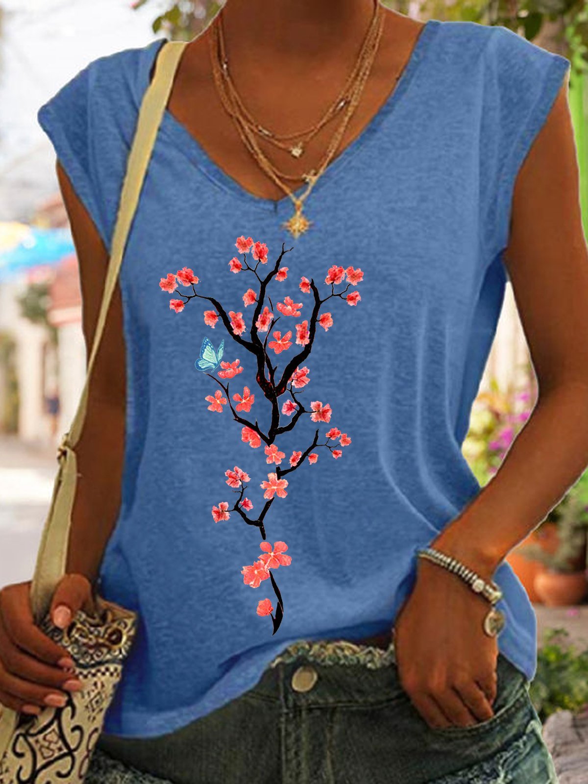 Women's Beautiful Blossom Print Casual V Neck Cotton-Blend Tank Top