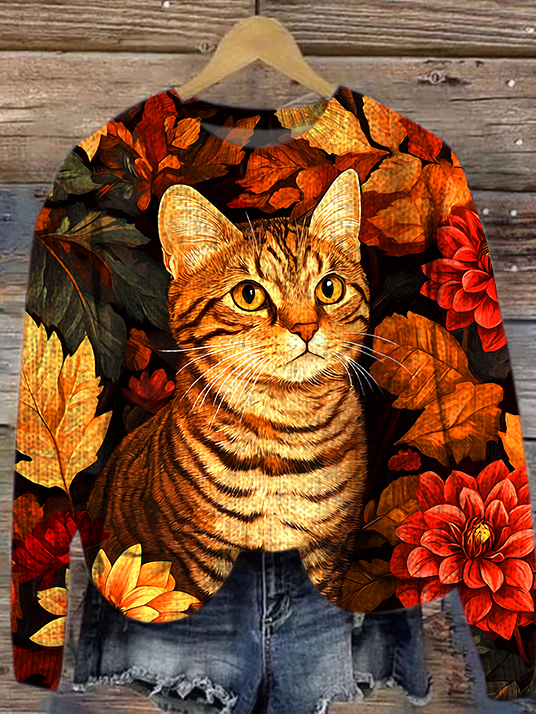 Cat Crew Neck Loose Maple Leaf Casual Sweater