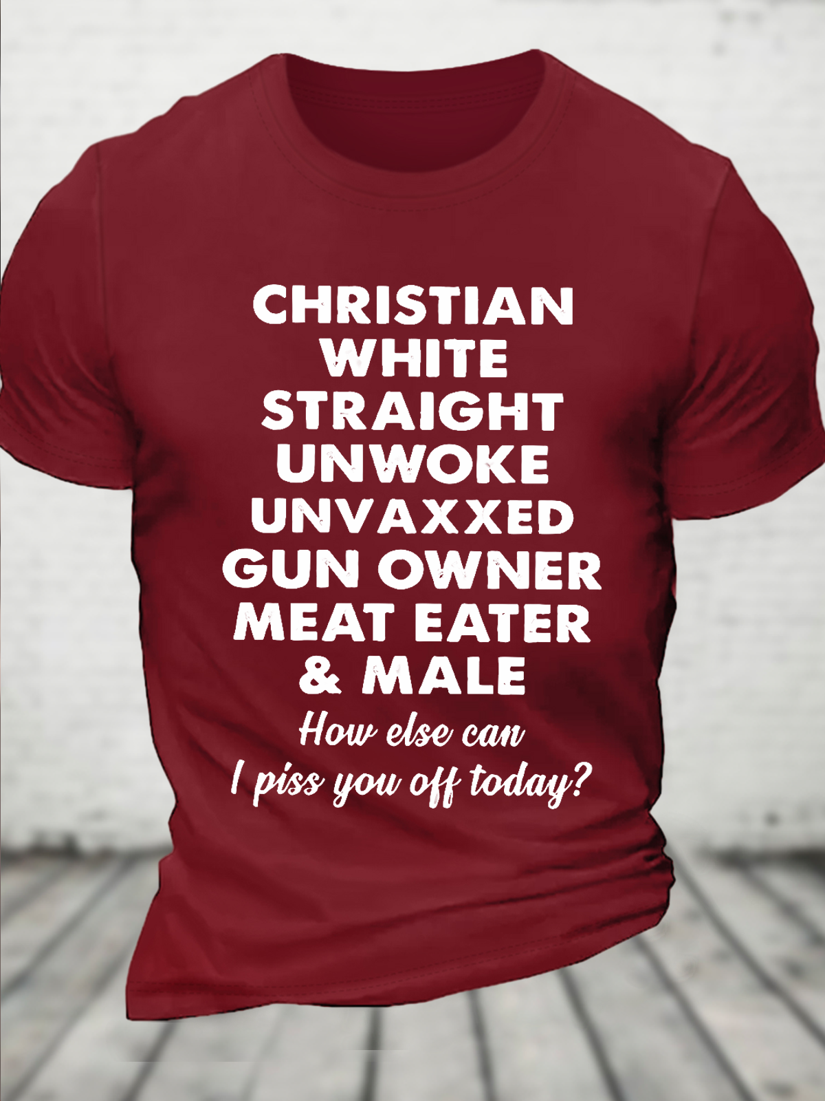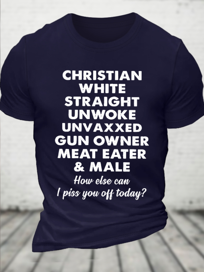 Cotton Christian White Straight Unwoke Unvaxxed Gun Owner Meat Eater Male How Else Can I Piss You Off Today Text Letters T-Shirt