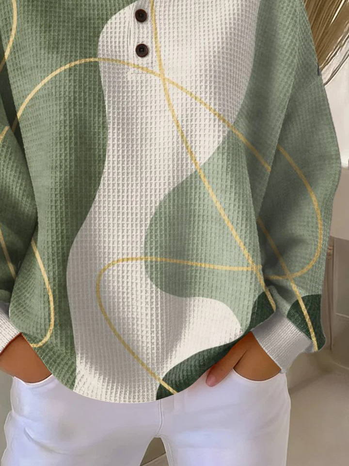 Women's Abstract Print Button-Up Casual Waffle Knit Sweatshirt