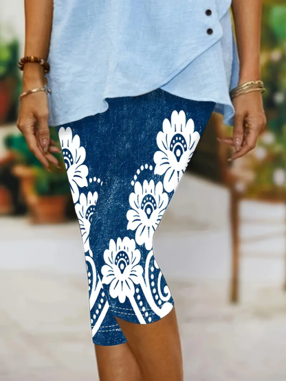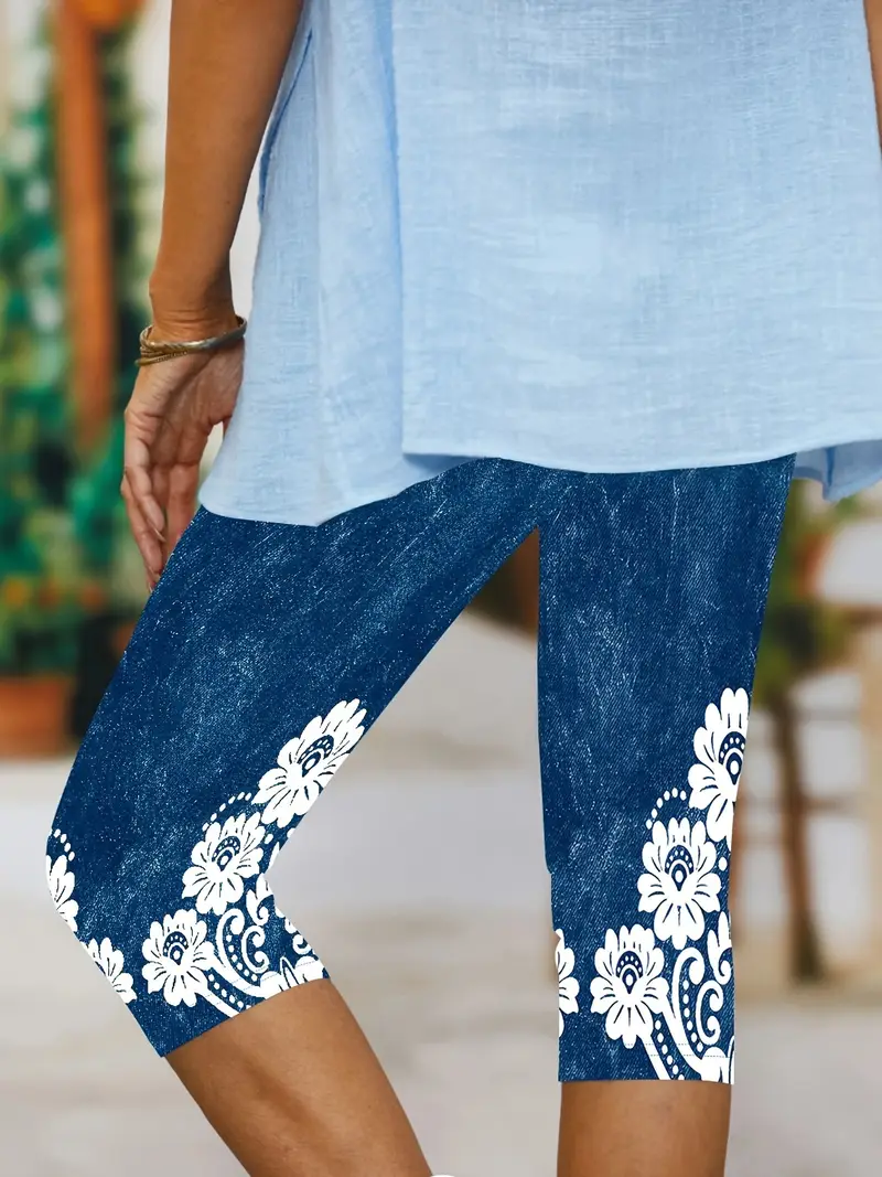 Women's Faux Denim Floral Print Spring Casual Leggings