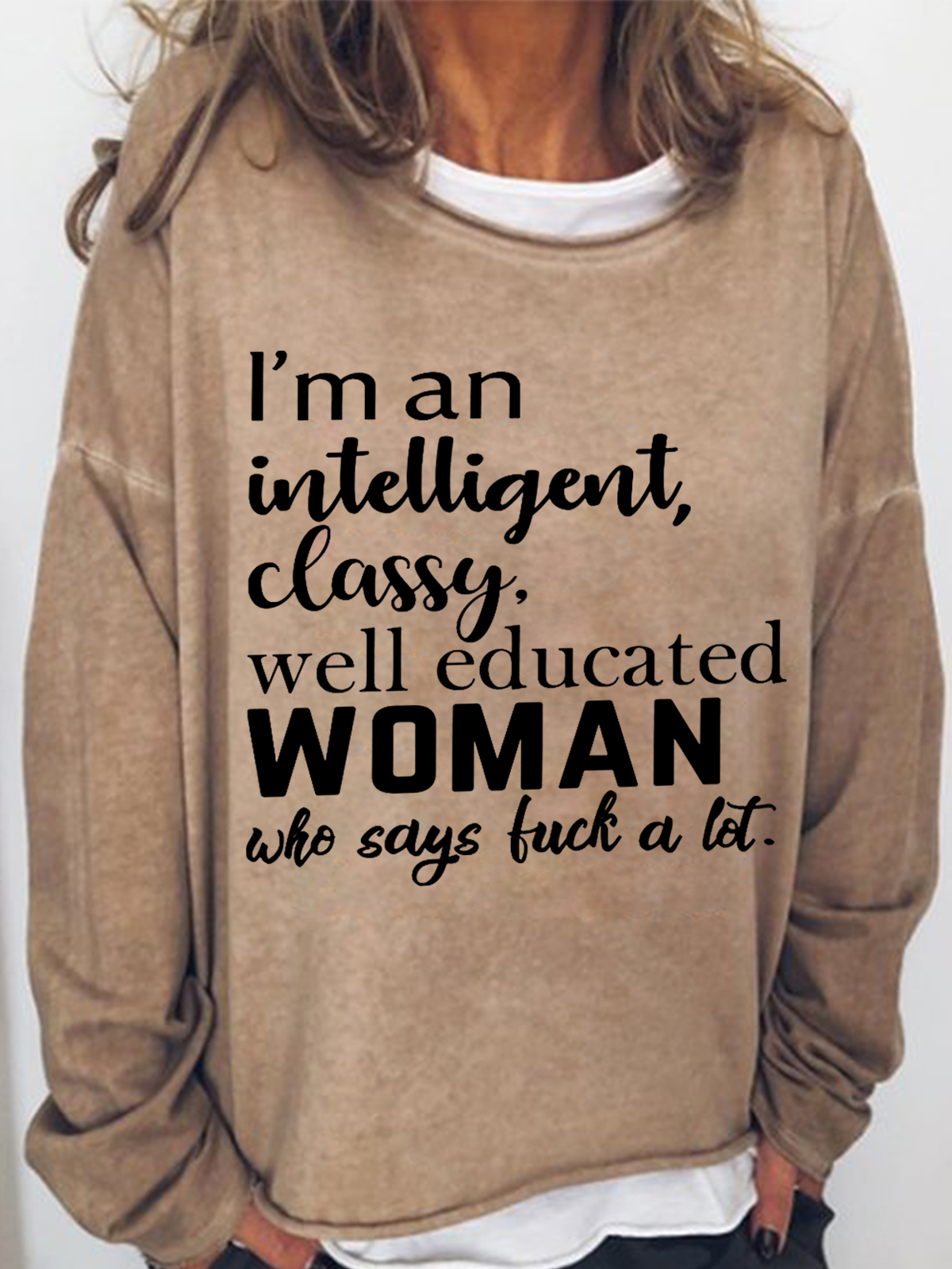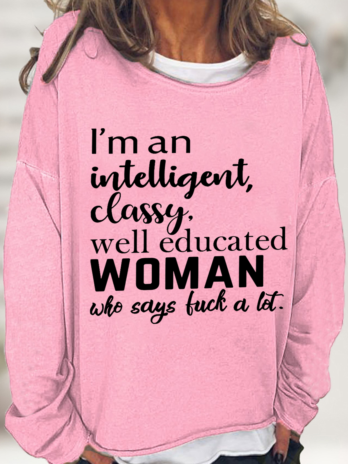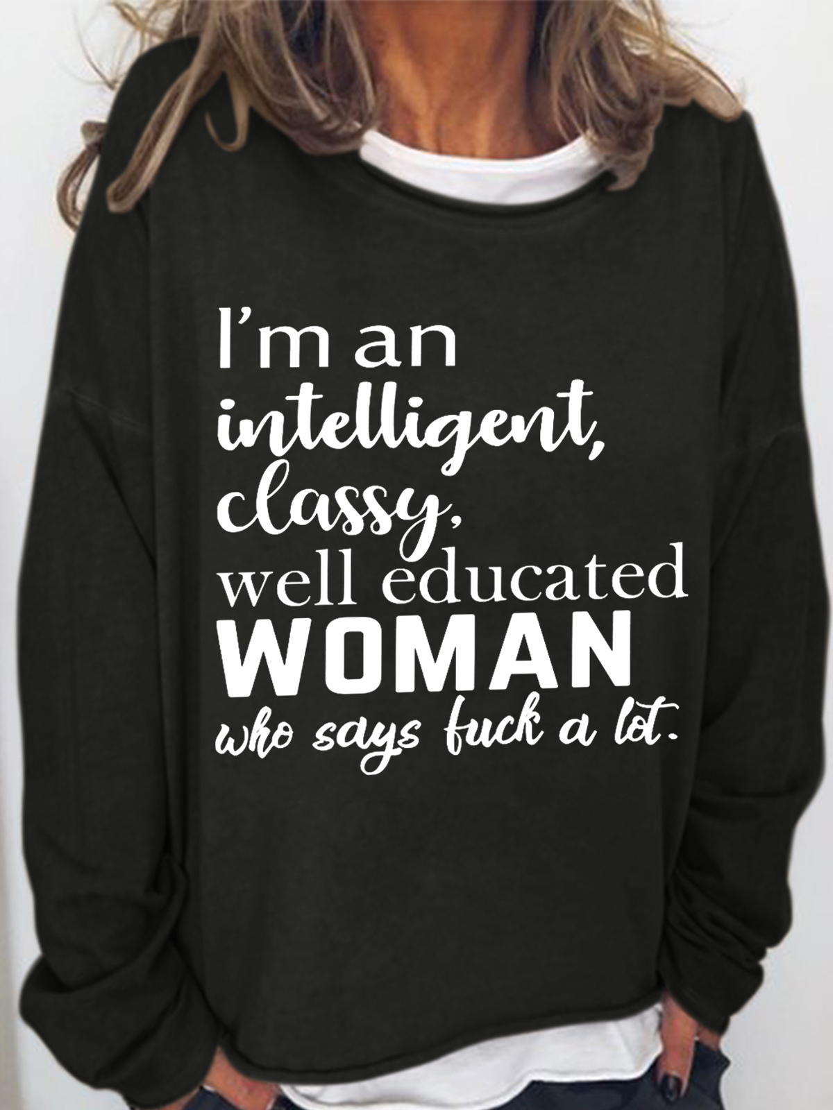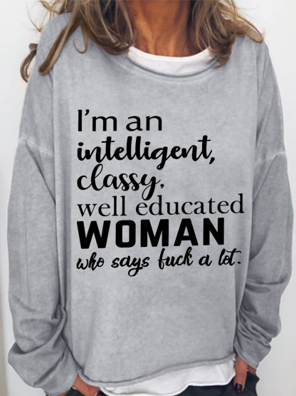 Women's Funny Cuss Word I'M An Intelligent Classy Well Educated Woman Who Says Fuck A Lot Cotton-Blend Text Letters Sweatshirt