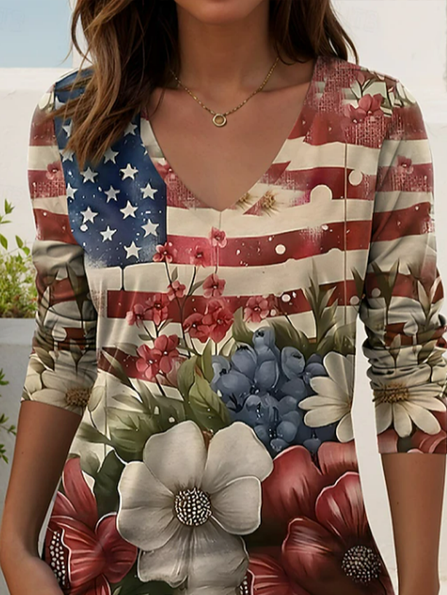Women's Long Sleeve T-shirt Spring/Fall As Picture America Flag Printing V Neck Holiday Going Out Casual Top
