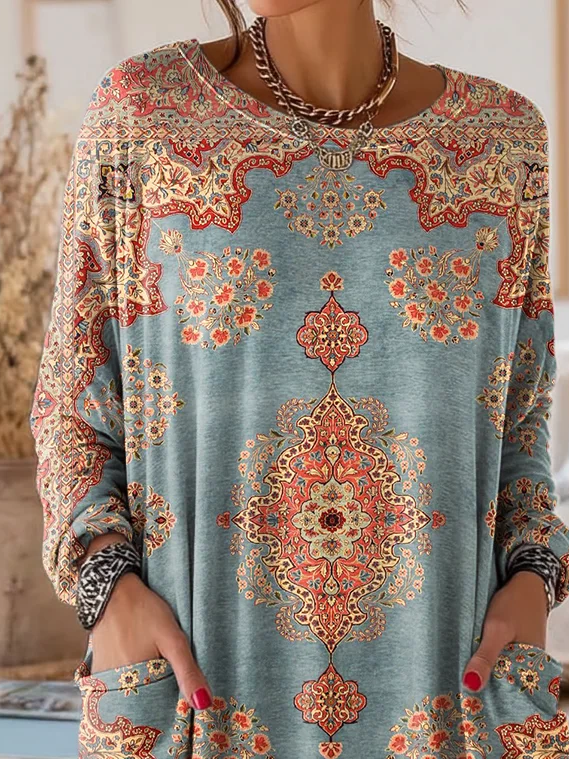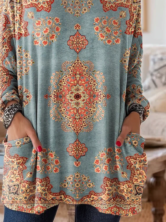 Women's Long Sleeve T-shirt Spring/Fall Blue Floral Printing Crew Neck Daily Going Out Vintage Top