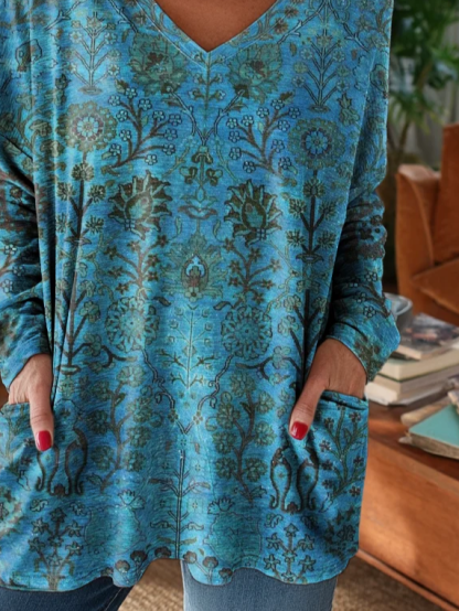 Women's Long Sleeve T-shirt Spring/Fall Blue Floral Printing V Neck Daily Going Out Vintage Top