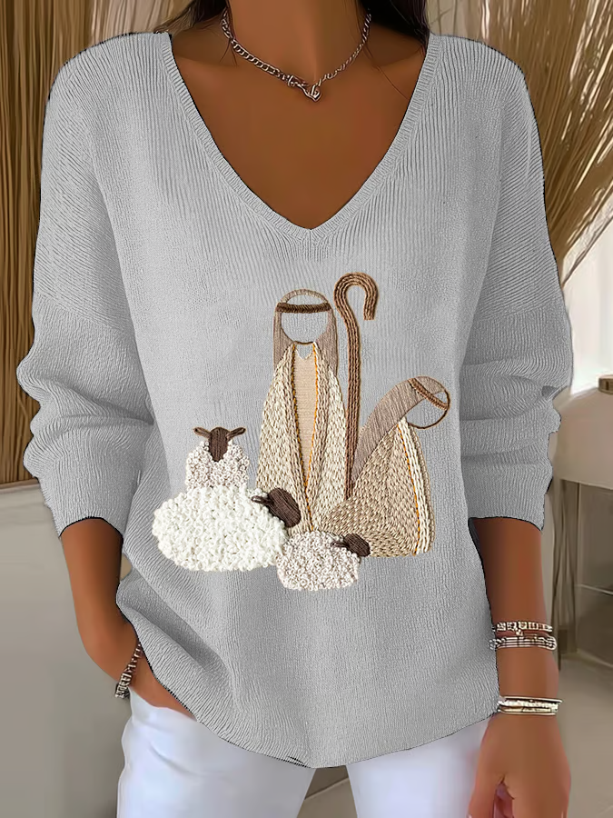 Women's Nativity Print V Neck Sweater