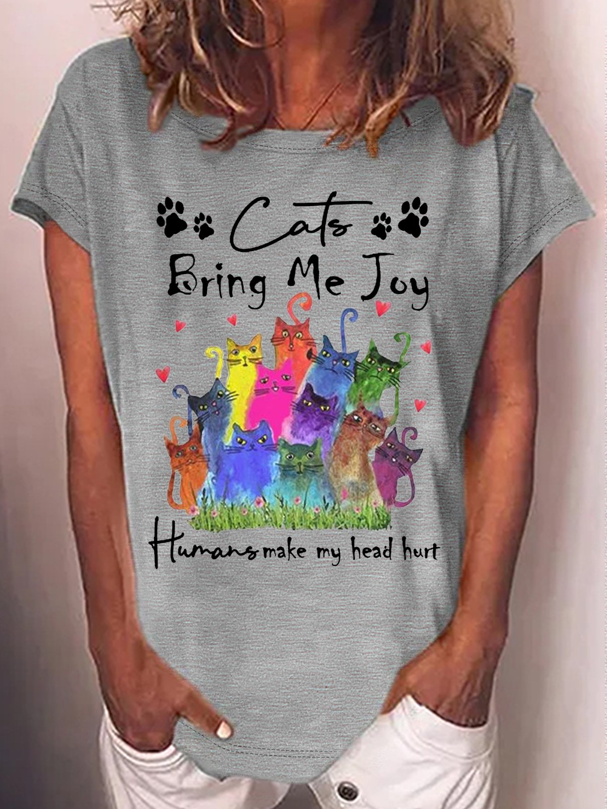 Women's Cats Bring Me Joy Humans Make My Head Hurt Casual Crew Neck T-Shirt