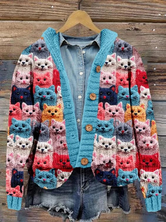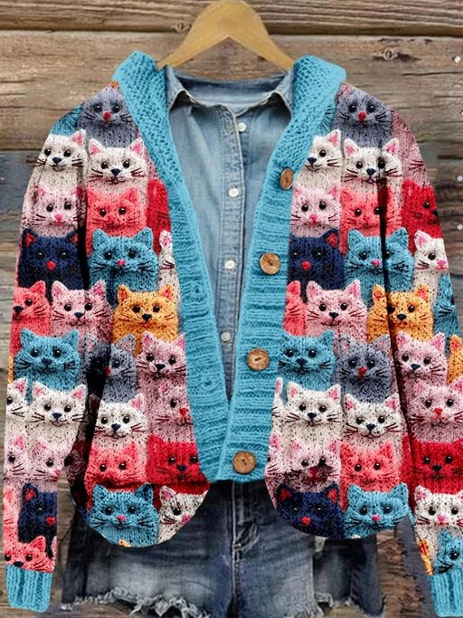 Crowded Cats Pink Knit Art Cozy Hooded Cardigan