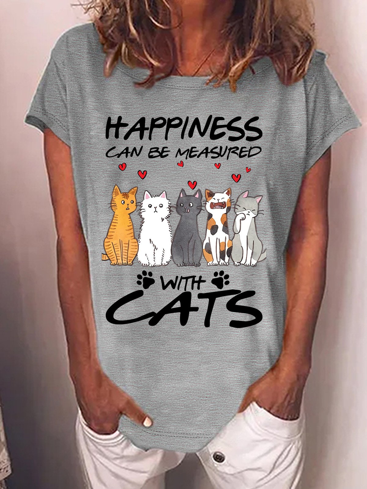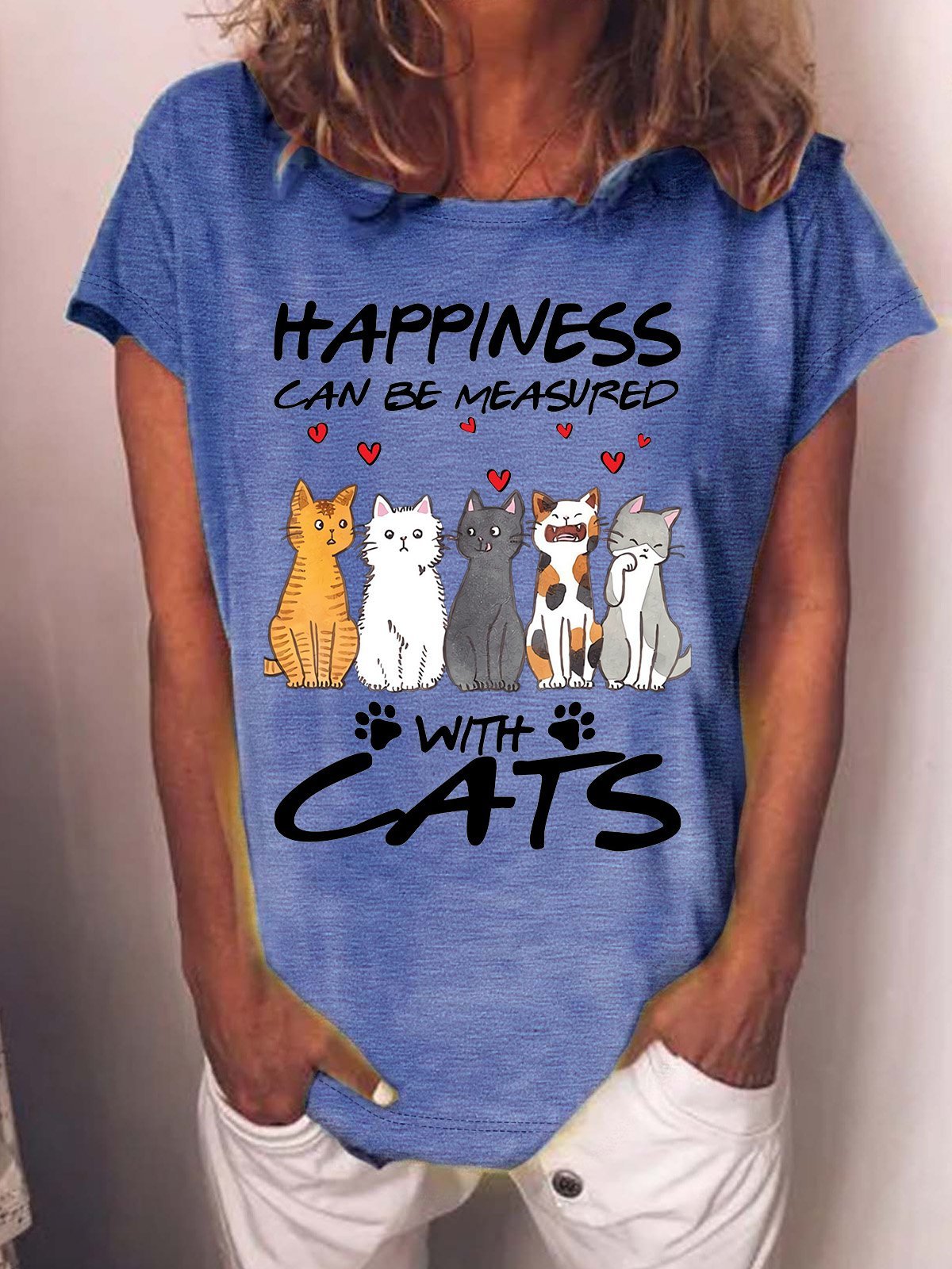 Women’s Happiness Can Be Measured With Cats Crew Neck Loose Casual T-Shirt